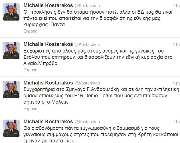 Στο μεταξύ, ο αρχηγός ΓΕΕΘΑ συγχαίρει την «εκπληκτική ομάδα επιδείξεως του F16 Demo Team υπό τον σμηναγό Γ. Ανδρουλάκη», της Πολεμικής Αεροπορίας για την «εντυπωσιακή παρουσία της» στο αεροδρόμιο του Μάλεμε, στο πλαίσιο των εορταστικών εκδηλώσεων για την 72η επέτειο της μάχης της Κρήτης.