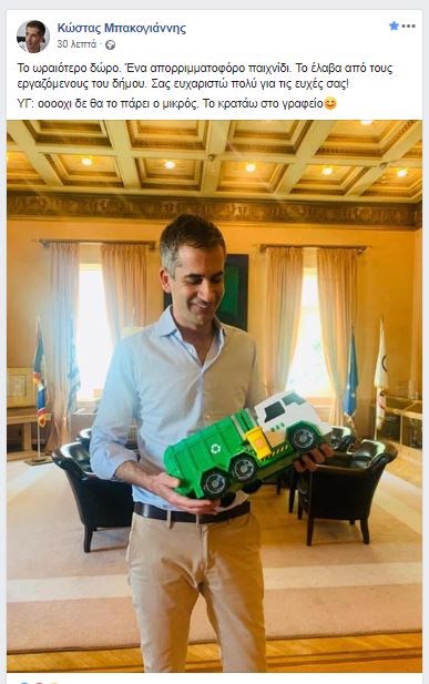 “Το ωραιότερο δώρο. Ένα απορριμματοφόρο παιχνίδι. Το έλαβα από τους εργαζόμενους του δήμου. Σας ευχαριστώ πολύ για τις ευχές σας! ΥΓ: οοοοχι δε θα το πάρει ο μικρός. Το κρατάω στο γραφείο” έγραψε ο κ. Μπακογιάννης.