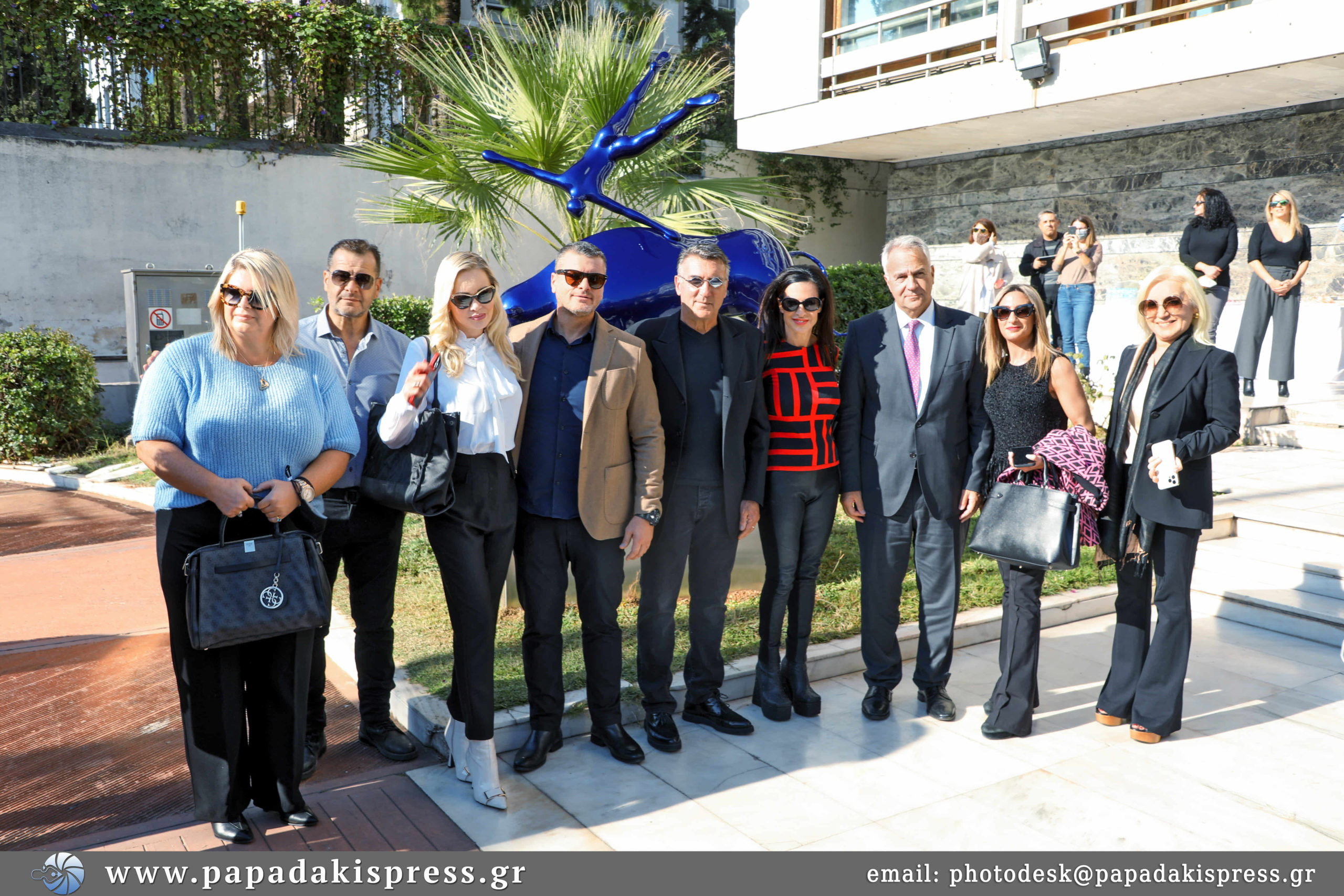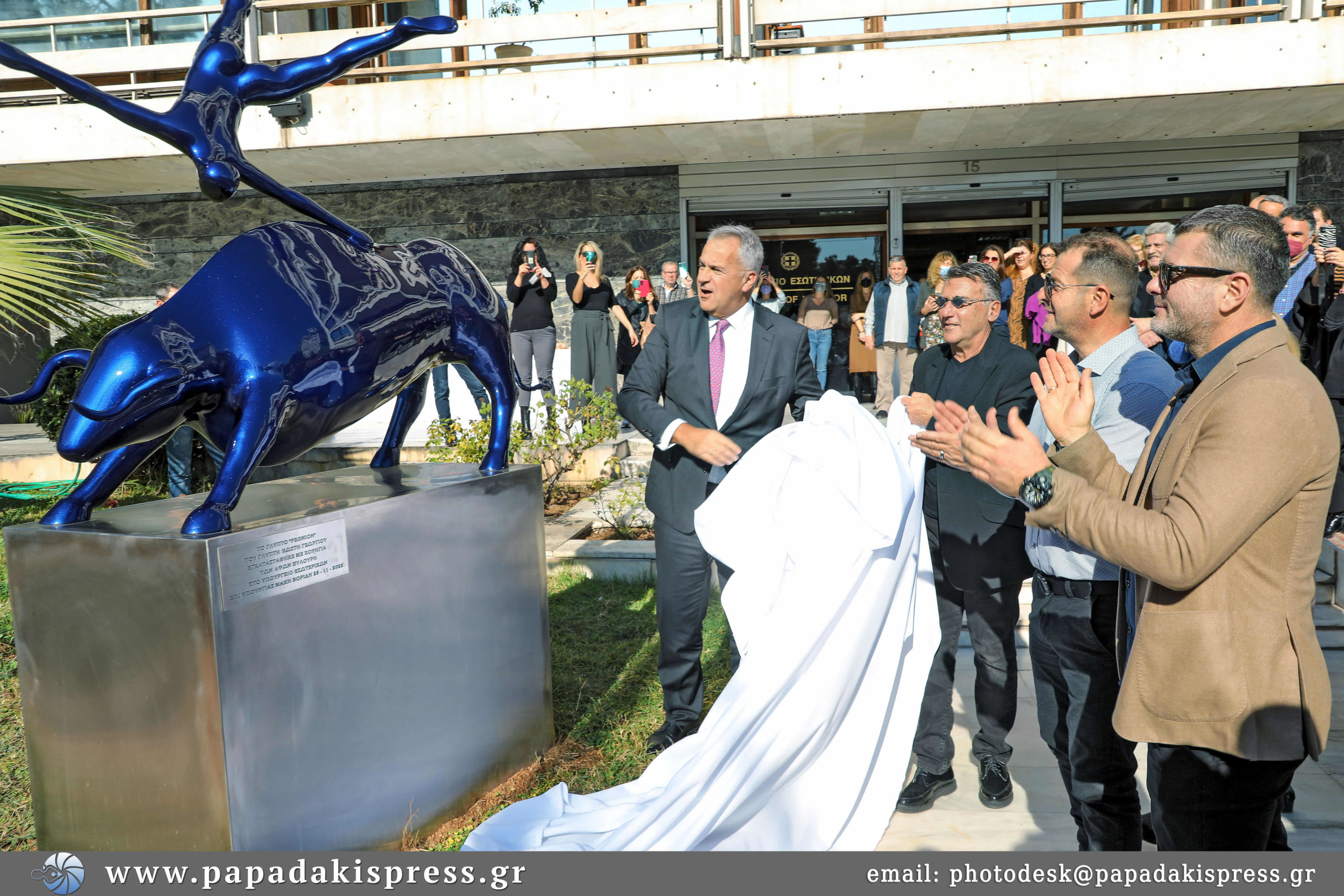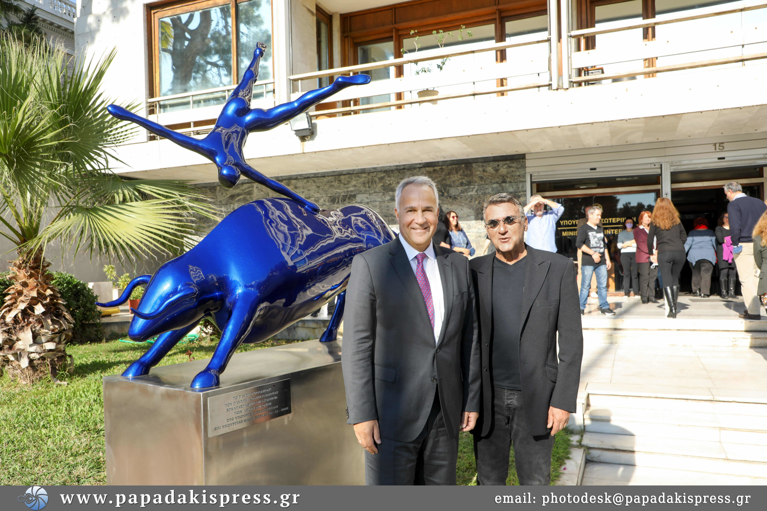 Τα αποκαλυπτήρια του εντυπωσιακού μπλε – στο χρώμα του κοβαλτίου – γλυπτού πραγματοποιήθηκαν από τον Υπουργό Εσωτερικών Μάκη Βορίδη σε επίσημη τελετή παρουσία του γλύπτη Κωστή Γεωργίου, των αδερφών Γιώργου και Νίκου Ξυλούρη καθώς και πλήθους προσκεκλημένων και εργαζομένων του Υπουργείου Εσωτερικών.
