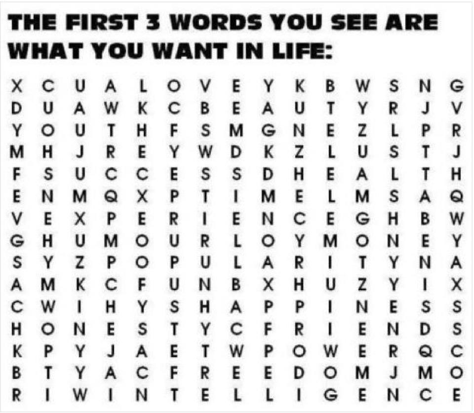 Το κουίζ που ακολουθεί σας προκαλεί να αφήσετε ελεύθερο το βλέμμα σας πάνω στον πίνακα. Οι δημιουργοί του υποστηρίζουν ότι οι τρεις πρώτες λέξεις που θα διαβάσετε είναι τα πράγματα που στην πραγματικότητα αναζητάτε για να είστε ευτυχισμένοι.