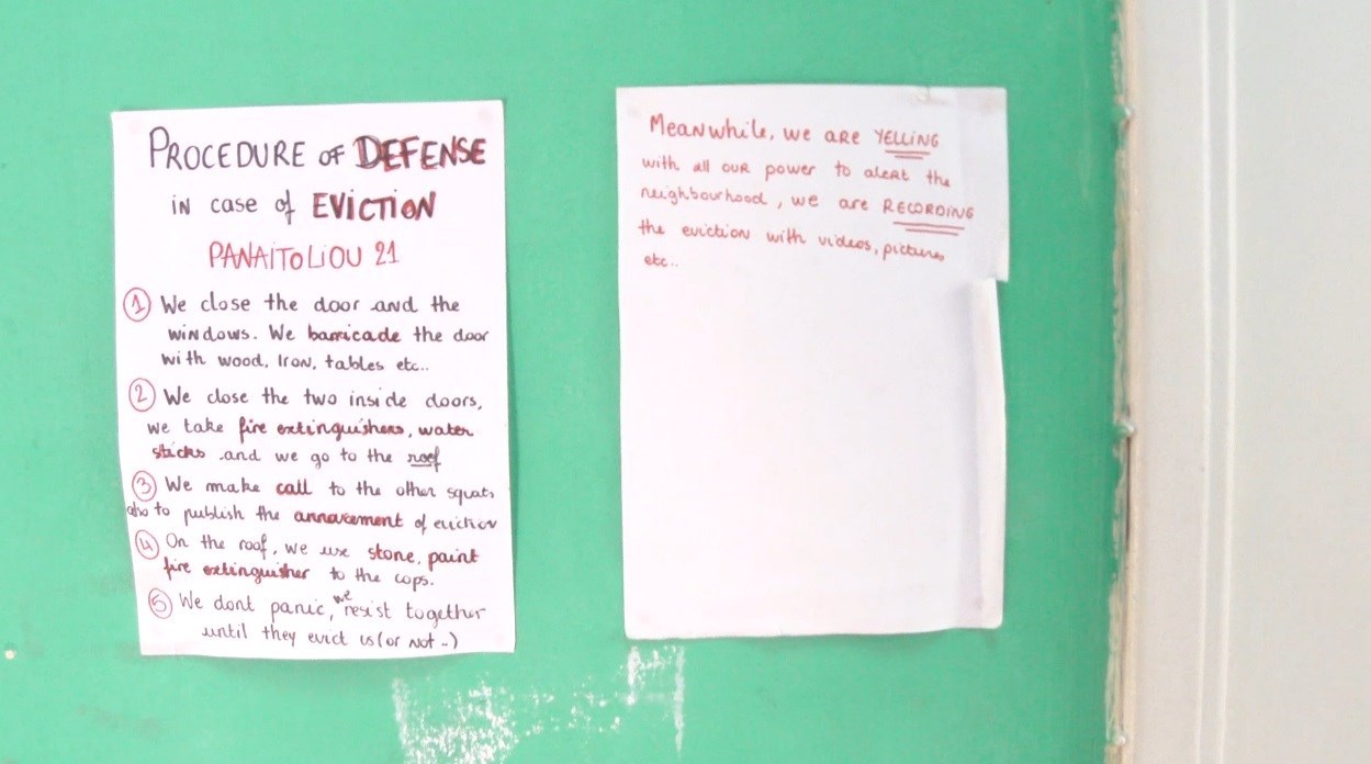 Σύμφωνα με τον εκπρόσωπο της ΕΛ.ΑΣ, μεταξύ των ευρημάτων στις καταλήψεις, υπήρχε ένα σημείωμα με οδηγίες στα αγγλικά. Οδηγίες, που σύμφωνα με την αστυνομία, θα έπρεπε να ακολουθήσουν οι καταληψίες σε περίπτωση επέμβασης της αστυνομίας.Το σημείωμα, το οποίο εντοπίστηκε στο κτίριο της Ματρόζου, μεταφράστηκε από την ΕΛ.ΑΣ και αναφέρει: ΔΙΑΔΙΚΑΣΙΑ ΑΜΥΝΑΣ σε περίπτωση ΕΚΚΕΝΩΣΗΣΠΑΝΑΙΤΩΛΙΟΥ 211. Κλείνουμε την πόρτα και τα παράθυρα. Αμπαρώνουμε την πόρτα με ξύλα, σίδερα, τραπέζια κλπ2. Κλείνουμε τις δύο εσωτερικές πόρτες, παίρνουμε τους πυροσβεστήρες, σωλήνες και ανεβαίνουμε στην ταράτσα3. Κάνουμε κάλεσμα στις άλλες καταλήψεις για να λάβει δημοσιότητα η προσπάθεια εκκένωσης4. Στην ταράτσα, χρησιμοποιούμε πέτρες, μπογιά, πυροσβεστήρες στους μπάτσους5. Δεν πανικοβαλλόμαστε, αντιστεκόμαστε μαζί μέχρι να μας βγάλουν έξω (ή και όχι)Στο μεταξύ, ΦΩΝΑΖΟΥΜΕ με όλη μας τη δύναμη για να ειδοποιήσουμε/ξεσηκώσουμε τη γειτονιά. Καταγράφουμε την εκκένωση σε βίντεο, φωτογραφίες κλπ.