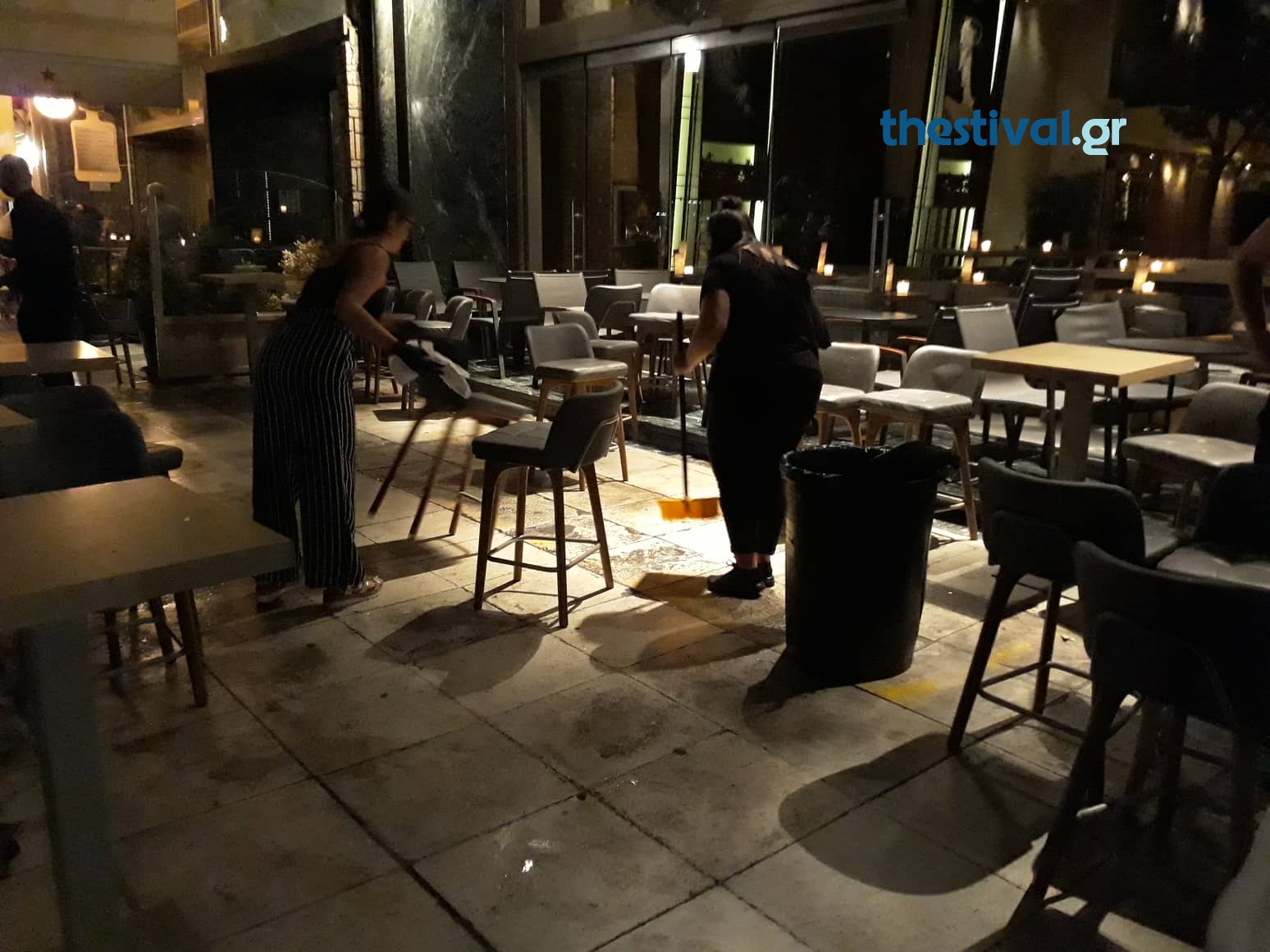 Μπουκάλια και ποτήρια κατέληξαν σε δρόμο και πεζοδρόμιo κι αυτή την ώρα οι υπάλληλοι των καταστημάτων προσπαθούν να βάλουν μια τάξη.