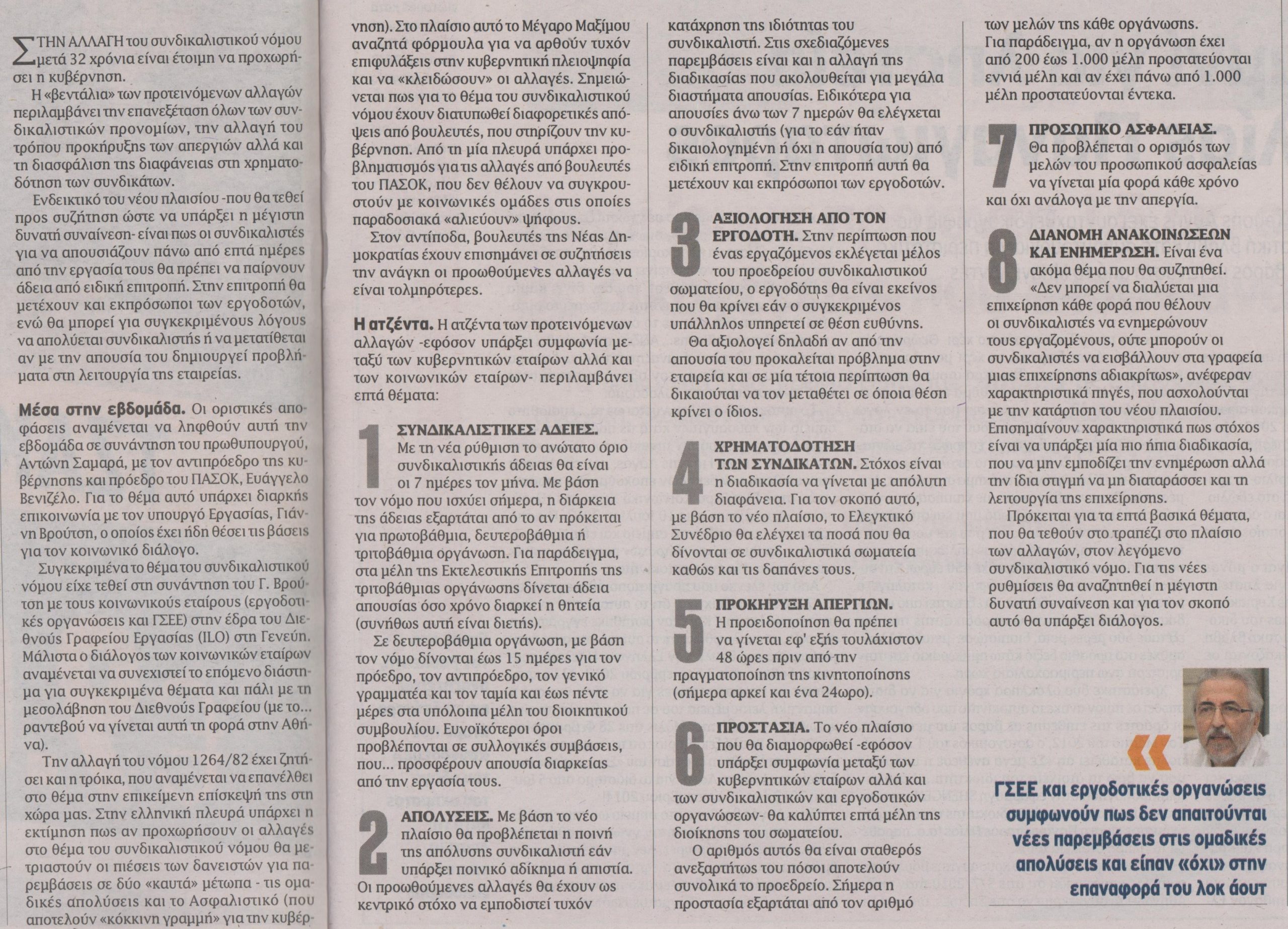 Ενδεικτικό του νέου πλαισίου –που θα τεθεί προς συζήτηση ώστε να υπάρξει η μέγιστη δυνατή συναίνεση- είναι πως οι συνδικαλιστές για να απουσιάζουν πάνω από επτά ημέρες από την εργασία τους θα πρέπει να παίρνουν άδεια από ειδική επιτροπή.