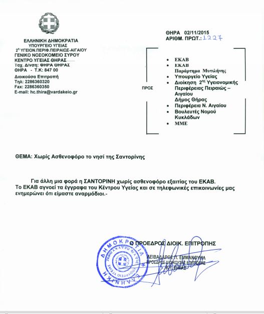 “Για άλλη μια φορά η Σαντορίνη χωρίς ασθενοφόρο εξαιτίας του ΕΚΑΒ. Το ΕΚΑΒ αγνοεί τα έγγραφα του κέντρου Υγείας και σε τηλεφωνικές επικοινωνίες μας ενημερώνει ότι είμαστε αναρμόδιο” αναφέρει σε έγγραφό του ο Εμμανουήλ Λειβαδάρος, πρόεδρος της Διοικούσας Επιτροπής του Κέντρου Υγείας Θήρας.