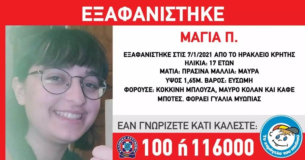Όπως έχει γράψει το cretapost, η 17χρονη Μάγια έφυγε από το σπίτι της το μεσημέρι της Πέμπτης για να επισκεφτεί κάποιο γιατρό και έκτοτε δεν έχει επικοινωνήσει με την οικογένεια της αλλά ούτε και με κάποιο άλλο συγγενικό ή φιλικό της πρόσωπο. Πληροφορίες αναφέρουν ότι το σήμα από το κινητό της νεαρής κοπέλας εντοπίστηκε ενεργοποιημένο στο Ηράκλειο, στις 17.55 το απόγευμα της Πέμπτης και έκτοτε είναι κλειστό.