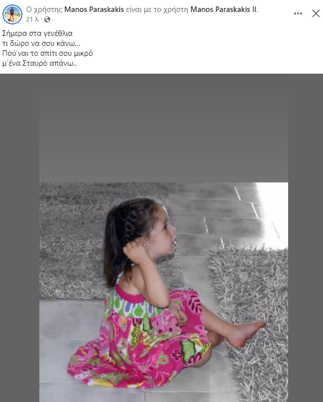 Η μικρή Μελίνα θα έσβηνε 12 κεράκια σήμερα και ο πατέρας της, Μάνος Παρασκάκης έκανε μια συγκινητική ανάρτηση στο προσωπικό του προφίλ στο facebook, σύμφωνα με το cretapost.