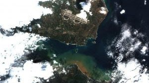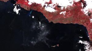 Η επόμενη δορυφορική φωτογραφία αφορά και πάλι τον νομό Χανίων και έχει εστιαστεί πάνω από το Ελαφονήσι όπου διακρίνεται το φυτοπλαγκτόν της θάλασσας με ανοιχτό θαλασσί χρώμα.