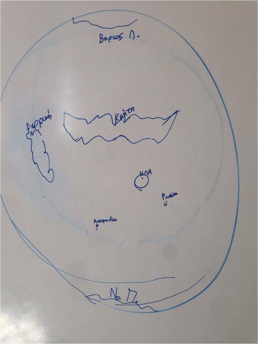 Ποια Αμερική, ποια Ρωσία, ποια Αυστραλία, ποια Αφρική! Η Κρήτη μας. Η Κρήτη της μεγάλης και αδίδακτης ιστορίας. Αυτή είναι το κέντρο του κόσμου, το κέντρο της μαθήτριας της Στ΄ τάξης του Δημοτικού Σχολείου Θραψανού που ζωγράφισε την υδρόγειο σφαίρα και τοποθέτησε την Κρήτη μετά από το μάθημα «Η Μάχη της Κρήτης».