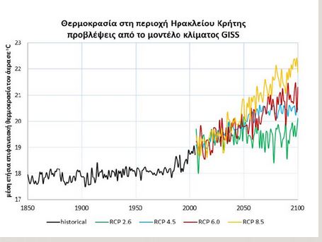 Η παρακάτω εικόνα δείχνει τη μεταβολή της μέσης ετήσιας θερμοκρασίας στην ευρύτερη περιοχή του Ηρακλείου Κρήτης, από το 1850 μέχρι το 2100. Για ευκρίνεια στην εικόνα δεν συμπεριλαμβάνονται οι υπολογισμοί τυπικών αποκλίσεων από αυτές τις τιμές.