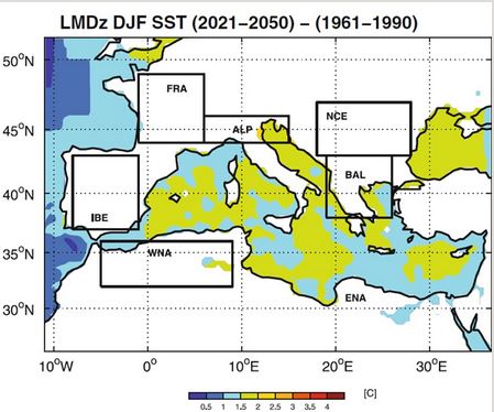 Πρόκειται για τη μεταβολή της θερμοκρασίας στην επιφάνεια της θάλασσας (SST) – Η περιοχή της Κρήτης αναμένεται να βιώσει αύξηση της θερμοκρασίας στο επιφανειακό νερό της θάλασσας κατά περίπου 1.5oC.