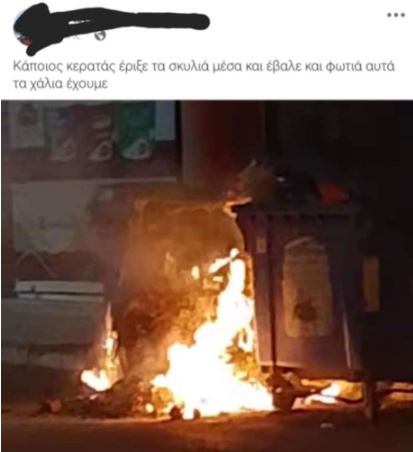 Από το σημείο περνούσε κάτοικος της περιοχής, σύμφωνα με τον οποίο, μέσα στους κάδους, κάποιος είχε πετάξει κουταβάκια, με σκοπό να τα κάψει ζωντανά.