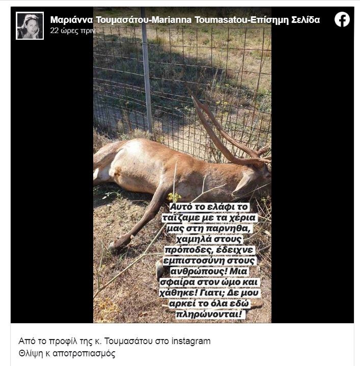 Ανάρτηση για το θέμα έκανε η ηθοποιός Μαριάννα Τουμασάτου. Όπως γράφει η γνωστή ηθοποιός: ” Αυτό το ελάφι το ταΐζαμε με τα χέρια μας στην Πάρνηθα, χαμηλά στους πρόποδες. Έδειχνε εμπιστοσύνη στους ανθρώπους. Μια σφαίρα στον ώμο και χάθηκε. Γιατί; Δεν μου αρκεί το όλα εδώ πληρώνονται!”.