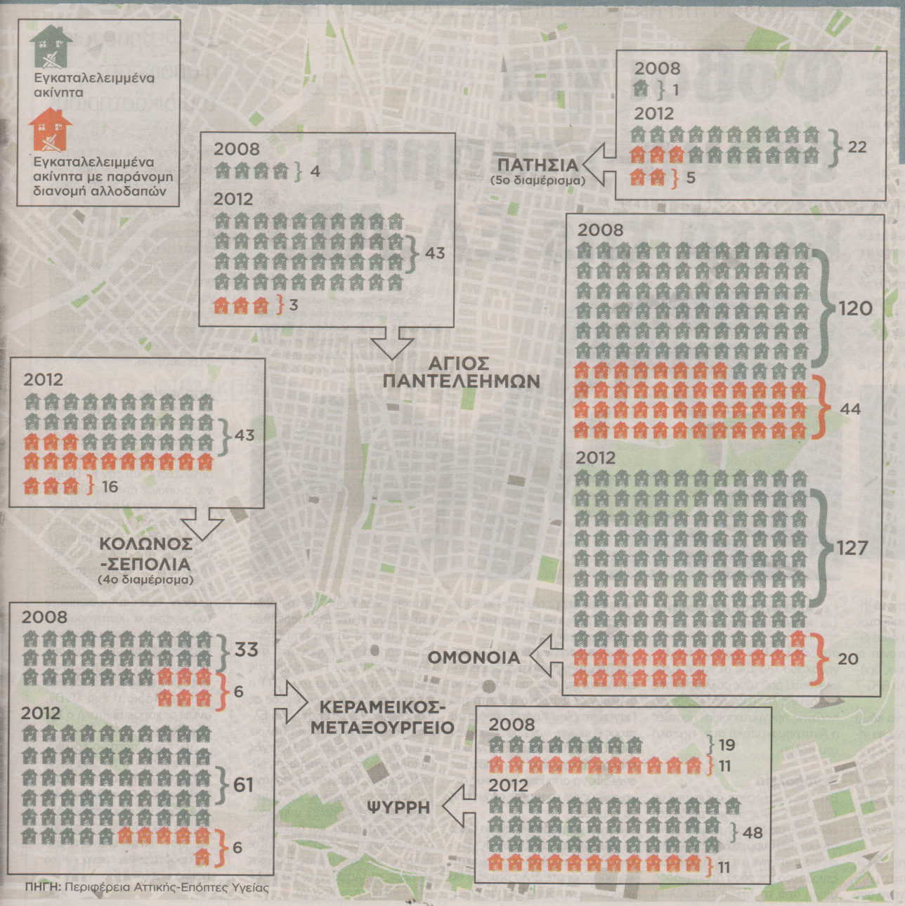 Η Ομόνοια, περιοχή στην οποία επικεντρώθηκαν τόσο οι αναφορές για το κέντρο που πεθαίνει, όσο και οι «επιχειρήσεις εξυγίανσης» όπως ο «Ξένιος Ζευς», τα παρατημένα ακίνητα αυξήθηκαν από 120 (2008) σε 127 το 2012, ενώ εκείνα που στεγάζουν αλλοδαπούς μειώθηκαν από 44 σε 20. Στη μικρή περιοχή του Ψυρρή, σύμφωνα με το δημοσίευμα, τα παρατημένα ακίνητα σχεδόν τριπλασιάστηκαν από 19 σε 48, ενώ εκείνα με τους αλλοδαπούς παρέμειναν σταθερά, 11. Σταθερή σε 6 ακίνητα έμεινε η διαμονή αλλοδαπών και στην περιοχή Κεραμεικού-Μεταξουργείου την ίδια περίοδο που τα εγκαταλελειμμένα σχεδόν διπλασιάστηκαν από 33 σε 61.