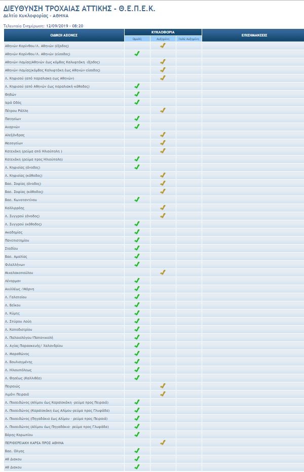Σύμφωνα με την ενημέρωση από την Τροχαία αυξημένη κίνηση παρατηρείται στα εξής σημεία: Αθηνών – Κορίνθου/Λ. Αθηνών (έξοδος), Αθηνών – Λαμίας (Αθηνών έως κόμβος Καλυφτάκη – έξοδος), Αθηνών – Λαμίας (κόμβος Καλυφτάκη έως Αθηνών- είσοδος), Λ. Κηφισού (από Παραλιακή έως Αθηνών), Πέτρου Ράλλη, Αλεξάνδρας, Μεσογείων, Κατεχάκη (ρεύμα από Ηλιούπολη), Λ. Κηφισίας (κάθοδος), Βασ. Σοφίας (άνοδος), Βασ. Σοφίας (κάθοδος), Λ. Συγγρού (άνοδος), Λ. Συγγρού (κάθοδος), Μιχαλακοπούλου, Πειραιώς, Λιμάνι Πειραιά, Περιφερειακή Καρέα προς Αθήνα.