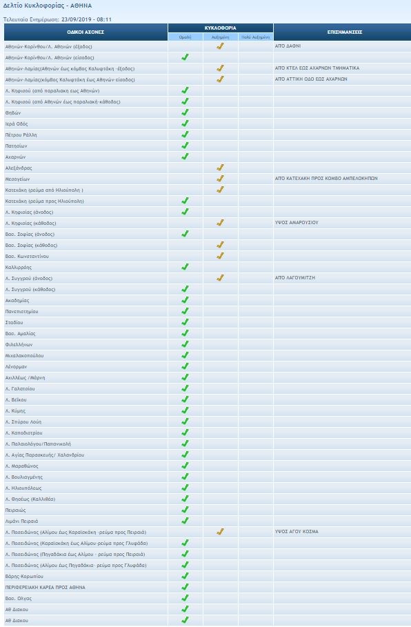 Σύμφωνα με την ενημέρωση από την Τροχαία αυξημένη κίνηση παρατηρείται στα εξής σημεία: Αθηνών-Κορίνθου/Λ. Αθηνών (έξοδος) από Δαφνί, Αθηνών-Λαμίας(Αθηνών έως κόμβος Καλυφτάκη -έξοδος) από ΚΤΕΛ έως Αχαρνών (τμηματικά), Αθηνών-Λαμίας(κόμβος Καλυφτάκη έως Αθηνών-είσοδος) από Αττική Οδό έως Αχαρνών, Αλεξάνδρας, Μεσογείων από Κατεχάκη προς κόμβο Αμπελοκήπων, Κατεχάκη (ρεύμα από Ηλιούπολη), Λ. Κηφισίας (κάθοδος) ύψος Αμαρουσίου, Βασ. Σοφίας (κάθοδος), Βασ. Κωνσταντίνου, Λ. Συγγρού (άνοδος) από Λαγουμιτζή, Λ. Ποσειδώνος (Αλίμου έως Καραϊσκάκη -ρεύμα προς Πειραιά) ύψος Αγίου Κοσμά.