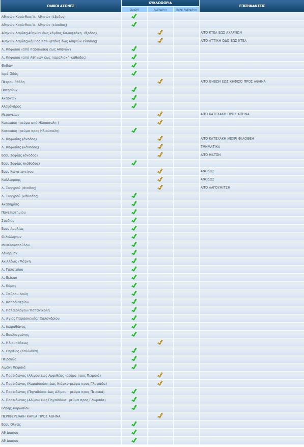 Σύμφωνα με την ενημέρωση από την Τροχαία αυξημένη κίνηση παρατηρείται στα εξής σημεία: Αθηνών-Λαμίας(Αθηνών έως κόμβος Καλυφτάκη -έξοδος) από ΚΤΕΛ έως Αχαρνών, Αθηνών-Λαμίας(κόμβος Καλυφτάκη έως Αθηνών-είσοδος) από Αττική Οδό έως ΚΤΕΛ, Πέτρου Ράλλη από Θηβών έως Κηφισό προς Αθήνα, Μεσογείων από Κατεχάκη προς Αθήνα, Κατεχάκη (ρεύμα από Ηλιούπολη), Λ. Κηφισίας (άνοδος) από Κατεχάκη μέχρι Φιλοθέη, Λ. Κηφισίας (κάθοδος), Βασ. Σοφίας (άνοδος), Βασ. Κωνσταντίνου (άνοδος), Καλλιρρόης (άνοδος), Λ. Συγγρού (άνοδος) από Λαγουμιτζή, Λ. Ηλιουπόλεως, Λ. Ποσειδώνος (Αλίμου έως Aμφιθέας – ρεύμα προς Πειραιά), Λ. Ποσειδώνος (Καραϊσκάκη έως Νιάρχο – ρεύμα προς Γλυφάδα), Περιφερειακή Καρέα προς Αθήνα.
