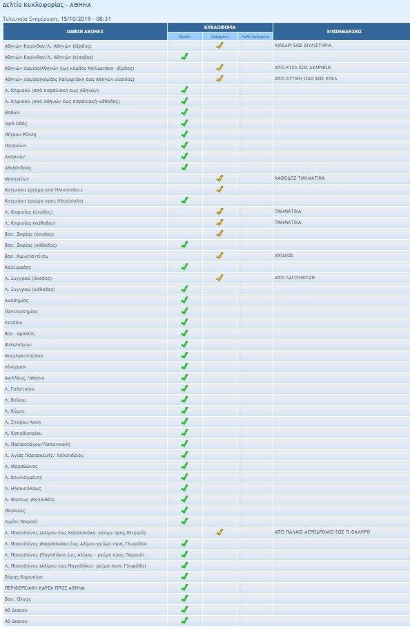 Σύμφωνα με την ενημέρωση από την Τροχαία αυξημένη κίνηση παρατηρείται στα εξής σημεία: Αθηνών – Κορίνθου/Λ. Αθηνών (έξοδος) από Χαϊδάρι έως Διυλιστήρια, Αθηνών – Λαμίας (Αθηνών έως κόμβος Καλυφτάκη – έξοδος) από ΚΤΕΛ έως Αχαρνών, Αθηνών – Λαμίας (κόμβος Καλυφτάκη έως Αθηνών – είσοδος) από Αττική Οδό έως ΚΤΕΛ, Μεσογείων (κάθοδος τμηματικά), Κατεχάκη (ρεύμα από Ηλιούπολη), Λ. Κηφισίας (άνοδος), Λ. Κηφισίας (κάθοδος), Βασ. Σοφίας (άνοδος), Βασ. Κωνσταντίνου (άνοδος), Λ. Συγγρού (άνοδος) από Λαγουμιτζή, Λ. Ποσειδώνος (Αλίμου έως Καραϊσκάκη -ρεύμα προς Πειραιά) από παλιό αεροδρόμιο έως Παλαιό Φάληρο.