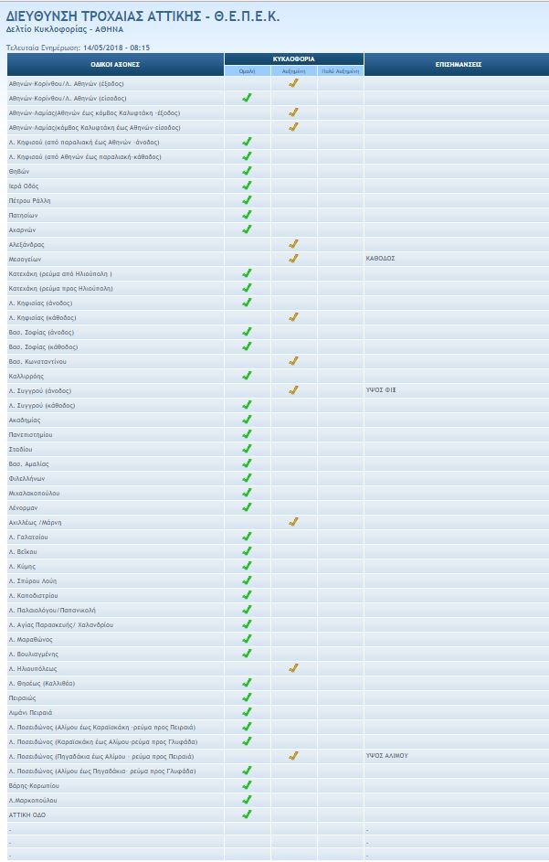 Σύμφωνα με την ενημέρωση από την τροχαία αυξημένη κίνηση παρατηρείται στα εξής σημεία: Αθηνών-Κορίνθου/Λ. Αθηνών (έξοδος), Αθηνών-Λαμίας (Αθηνών έως κόμβος Καλυφτάκη – έξοδος), Αθηνών-Λαμίας (κόμβος Καλυφτάκη έως Αθηνών – είσοδος), Αλεξάνδρας, Μεσογείων (κάθοδος), Λ. Κηφισίας (κάθοδος), Βασ. Κωνσταντίνου, Λ. Συγγρού (άνοδος) – ύψος Φιξ, Αχιλλέως /Μάρνη, Λ. Ηλιουπόλεως, Λ. Ποσειδώνος (Πηγαδάκια έως Αλίμου – ρεύμα προς Πειραιά) – ύψος Αλίμου.