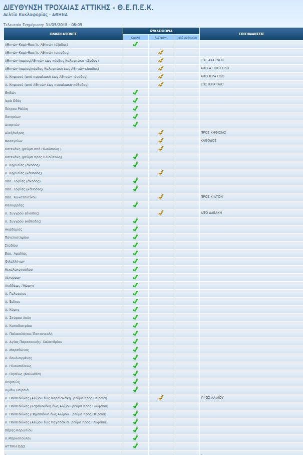 Σύμφωνα με την ενημέρωση από την τροχαία αυξημένη κίνηση παρατηρείται στα εξής σημεία: Αθηνών-Κορίνθου/Λ. Αθηνών (είσοδος), Αθηνών-Λαμίας(Αθηνών έως κόμβος Καλυφτάκη – έξοδος) έως Αχαρνών, Αθηνών-Λαμίας (κόμβος Καλυφτάκη έως Αθηνών – είσοδος) από Αττική Οδό, Λ. Κηφισού (από παραλιακή έως Αθηνών – άνοδος) από Ιερά Οδό, Λ. Κηφισού (από Αθηνών έως παραλιακή-κάθοδος) έως Ιερά Οδό, Αλεξάνδρας προς Κηφισίας, Μεσογείων (κάθοδος), Κατεχάκη (ρεύμα από Ηλιούπολη), Λ. Κηφισίας (κάθοδος), Βασ. Κωνσταντίνου προς Χίλτον, Λ. Συγγρού (κάθοδος) από Δαβάκη και Λ. Ποσειδώνος (Αλίμου έως Καραϊσκάκη – ρεύμα προς Πειραιά) ύψος Αλίμου.