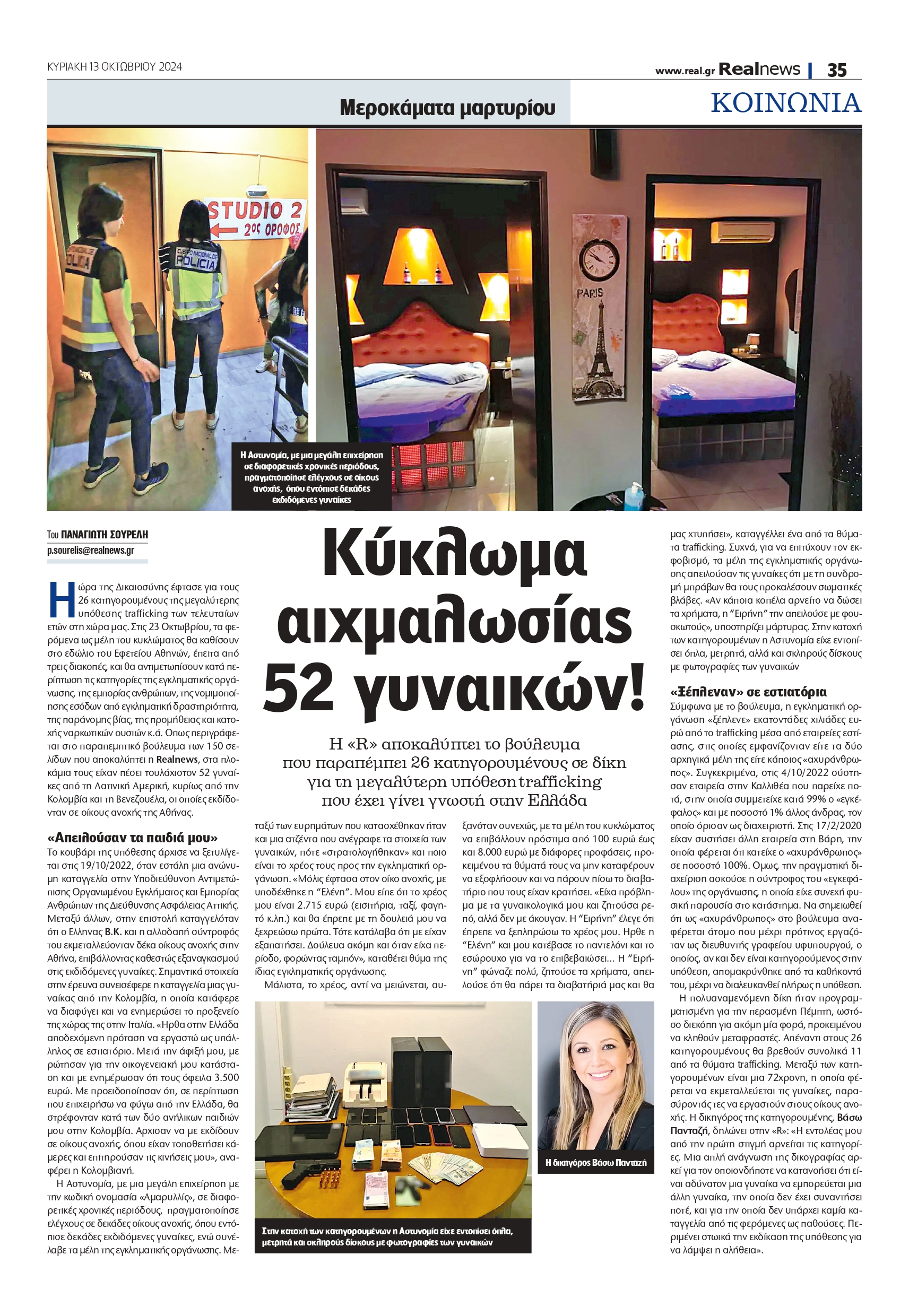 Η ώρα της Δικαιοσύνης έφτασε για τους 26 κατηγορουμένους της μεγαλύτερης υπόθεσης trafficking των τελευταίων ετών στη χώρα μας. Στις 23 Οκτωβρίου, τα φερόμενα ως μέλη του κυκλώματος θα καθίσουν στο εδώλιο του Εφετείου Αθηνών, έπειτα από τρεις διακοπές, και θα αντιμετωπίσουν κατά περίπτωση τις κατηγορίες της εγκληματικής οργάνωσης, της εμπορίας ανθρώπων, της νομιμοποίησης εσόδων από εγκληματική δραστηριότητα, τηςπαράνομης βίας, της προμήθειας και κατοχής ναρκωτικών ουσιών κ.ά. Οπως περιγράφεται στο παραπεμπτικό βούλευμα των 150 σελίδων που αποκαλύπτει η Realnews, στα πλοκάμια τους είχαν πέσει τουλάχιστον 52 γυναίκες από τη Λατινική Αμερική, κυρίως από την Κολομβία και τη Βενεζουέλα, οι οποίες εκδίδονταν σε οίκους ανοχής της Αθήνας.
