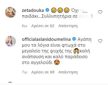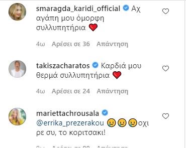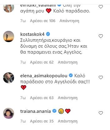 Η Σμαράγδα Καρύδη σημείωσε: “Αχ αγάπη μου όμορφη συλλυπητήρια” και ο Τάκης Ζαχαράτος “Καρδιά μου θερμά συλλυπητήρια”.