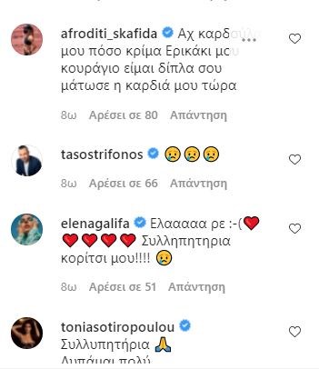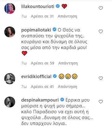 Η Έλενα Ασημακοπούλου ευχήθηκε “Καλό παράδεισο στο Αγγελούδι σας!!!” και η Πόπη Μαλιωτάκη έγραψε: “Ο Θεός να αναπαύσει την ψυχούλα της.. κουράγιο και δύναμη σε όλους σας μέσα από την καρδιά μου!”. Η Δέσποινα Καμπούρη επεσήμανε: “Έρρικα μου μαύρισε η ψυχή μου σήμερα… καλό Παράδεισο να έχει αυτή η ψυχούλα ..δύναμη σε όλους σας… δεν υπάρχουν λόγια”.