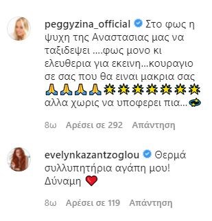 Η Πέγκυ Ζήνα έγραψε: “Στο φως η ψυχή της Αναστασίας μας να ταξιδέψει ….φως μόνο κι ελευθερία για εκείνη…κουράγιο σε σας που θα είναι μακριά σας αλλά χωρίς να υποφέρει πια”. Η επίσης αθλήτρια στο άλμα επί κοντώ Αφροδίτη Σκαφίδα σημείωσε: “Αχ καρδούλα μου πόσο κρίμα Ερρικάκι μου κουράγιο είμαι δίπλα σου μάτωσε η καρδιά μου τώρα”.