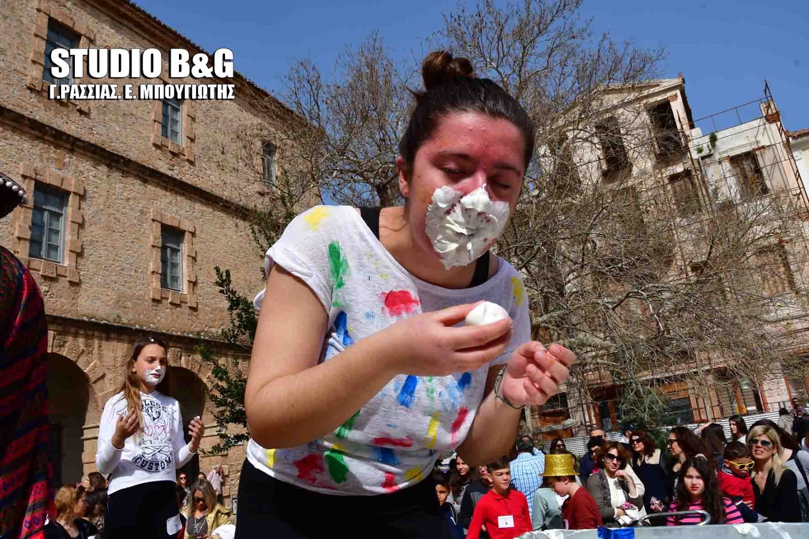 Με μεγάλη συμμετοχή αναβίωσε σήμερα το παραδοσιακό παιχνίδι «Το κυνήγι του χαμένου θησαυρού» στην Πλατεία Συντάγματος στο ιστορικό κέντρο της πόλης του Ναυπλίου.Ένα μέρος του παιχνιδιού θέλει τα παιδιά να βουτάνε με το πρόσωπο μέσα σε γιαούρτι και αφρό για να βρουν ένα γρίφο του κρυμμένου θησαυρού. Οι εορταστικές εκδηλώσεις διοργανώθηκαν από τον Δήμο Ναυπλιέων και τον ΔΟΠΠΑΤ, στοχεύουν στη διατήρηση της παράδοσης και την αναβίωση των εθίμων, παλαιών και νεότερων.Δείτε τις φωτο:
