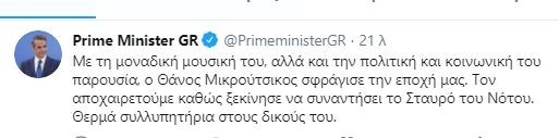 «Με τη μοναδική μουσική του, αλλά και την πολιτική και κοινωνική του παρουσία, ο Θάνος Μικρούτσικος σφράγισε την εποχή μας. Τον αποχαιρετούμε καθώς ξεκίνησε να συναντήσει το Σταυρό του Νότου. Θερμά συλλυπητήρια στους δικούς του» αναφέρει ο πρωθυπουργός Κυριάκος Μητσοτάκης σε ανάρτησή του στο twitter για το θάνατο του Θάνου Μικρούτσικου.