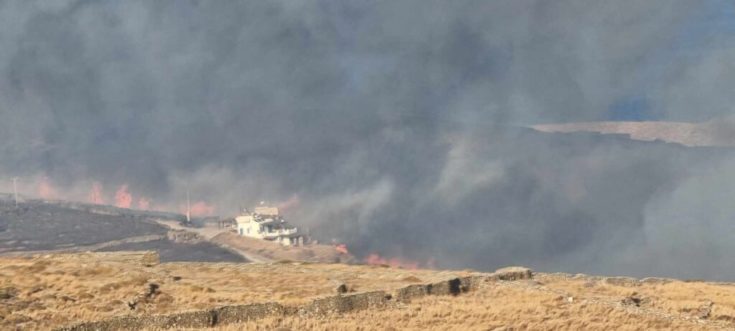 Η πυρκαγιά απειλεί κάποιες διάσπαρτες κατοικίες, ενώ το πύρινο μέτωπο είναι πολύ κοντά σε ξενοδοχειακό συγκρότημα. Στο νησί πνέουν ισχυροί άνεμοι.