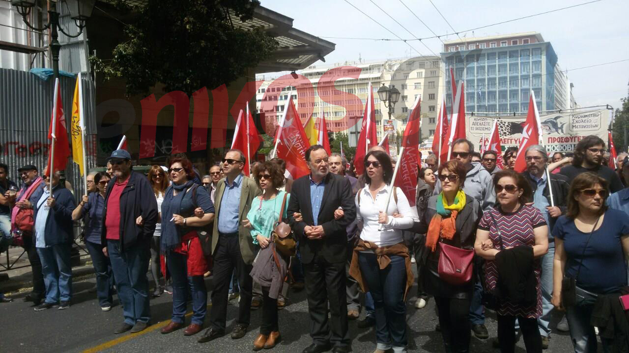 Ο επικεφαλής της Λαϊκής Ενότητας, Παναγιώτης Λαφαζάνης, μαζί με τον Δημήτρη Στρατούλη και δεκάδες μέλη του κόμματος στην συγκέντρωση διαμαρτυρίας κατά του ασφαλιστικού νομοσχεδίου.