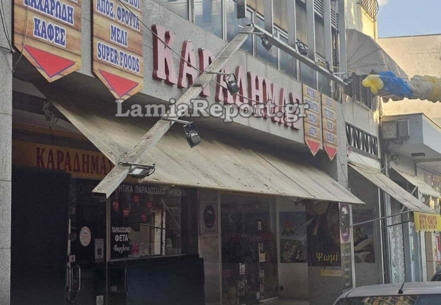Η σιδερένια ράγα με τους προβολείς κόπηκε στη μέση και πέφτοντας σταμάτησε στην άκρη της τέντας, πριν προσγειωθεί στο πεζοδρόμιο.