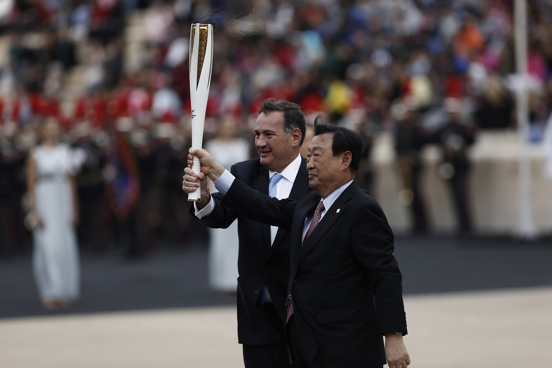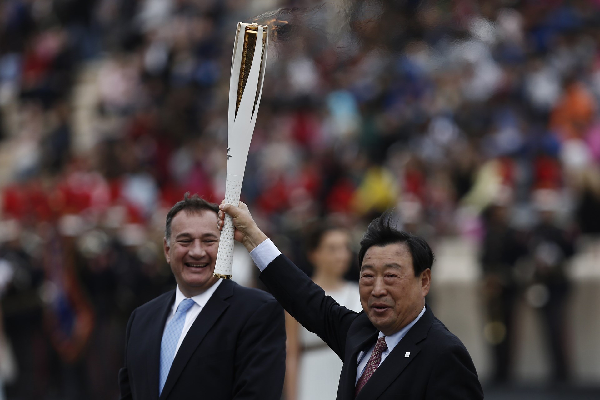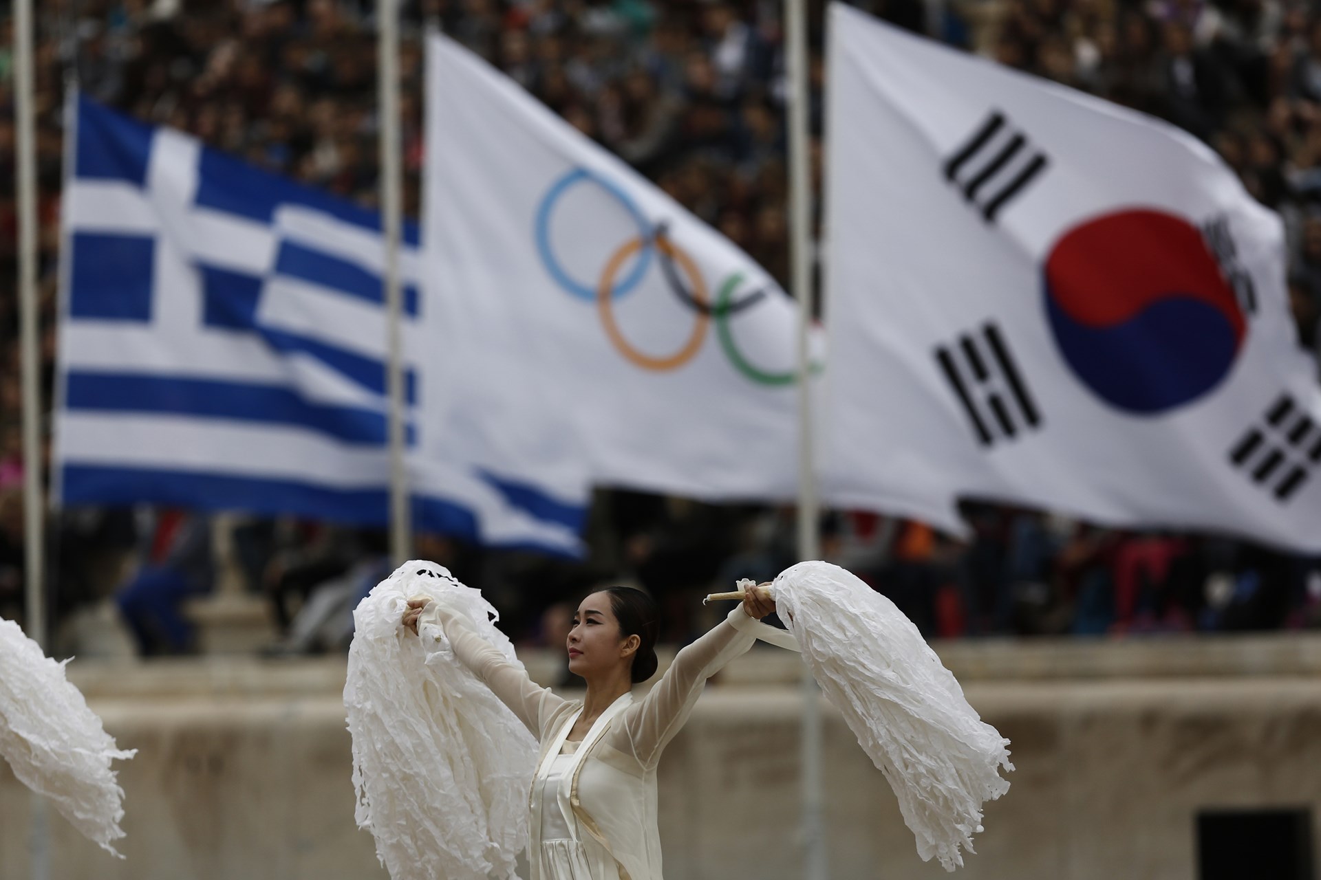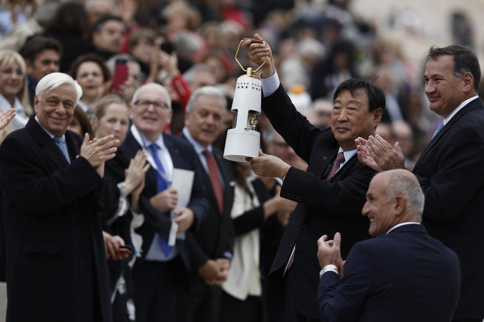 Την Ολυμπιακή Φλόγα παρέδωσε ο πρόεδρος της ΕΟΕ Σπύρος Καπράλος στο πρόεδρο της οργανωτικής επιτροπής της Πιονγκτσάνγκ Λι Χίι Μπεόμ, με την παρουσία στο Παναθηναϊκό Στάδιο πλήθους επισήμων και άνω των 15.000 θεατών που καταχειροκρότησαν εξαιρετικά δρώμενα που πραγματοποιήθηκαν καθώς και την καθιερωμένη τελετή που πραγματοποιήθηκε από την Πρωθιέρεια Κατερίνα Λέχου και τις Ιέρειες, σε χορογραφία της Αρτέμιδας Ιγνατίου.