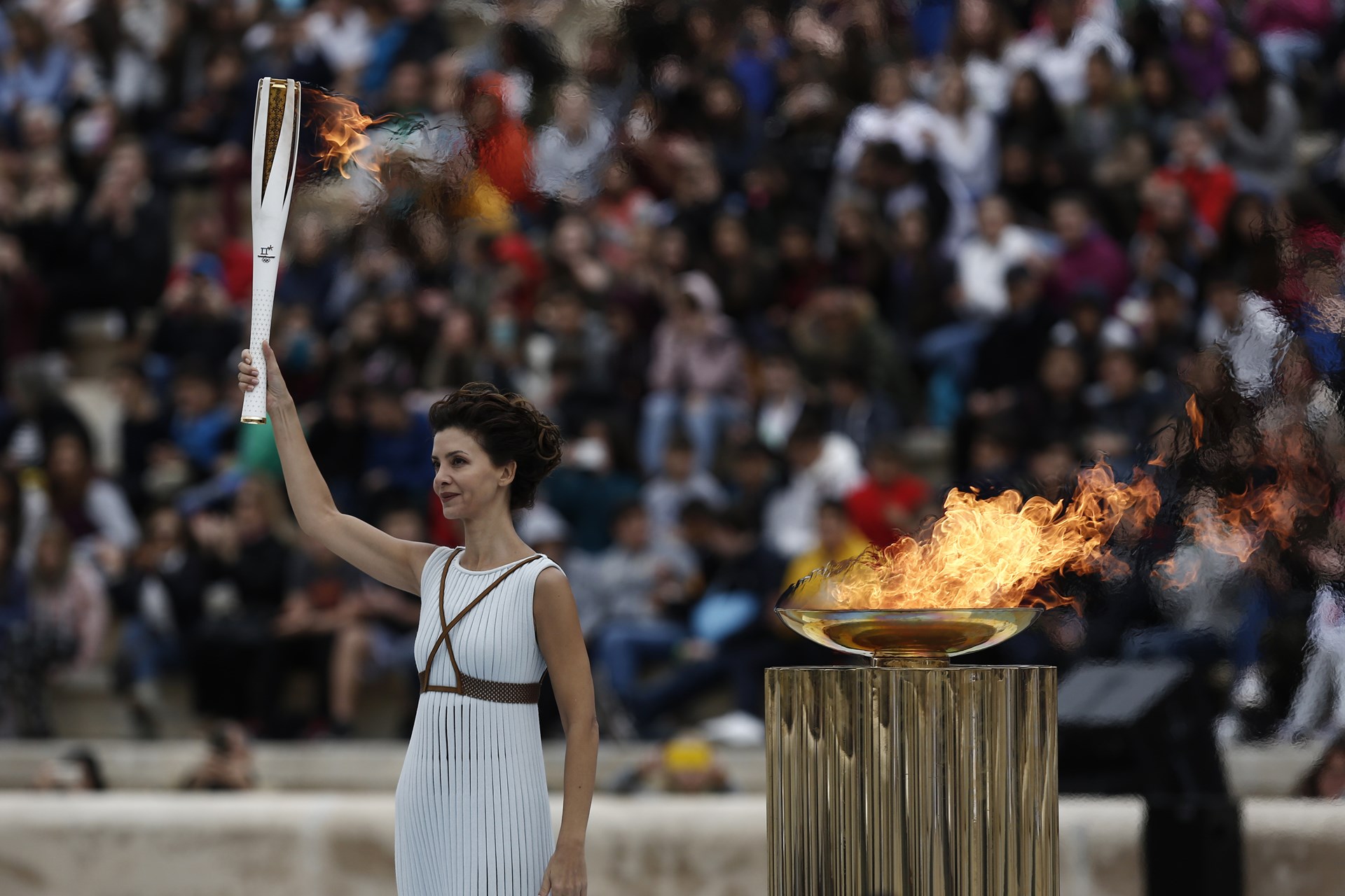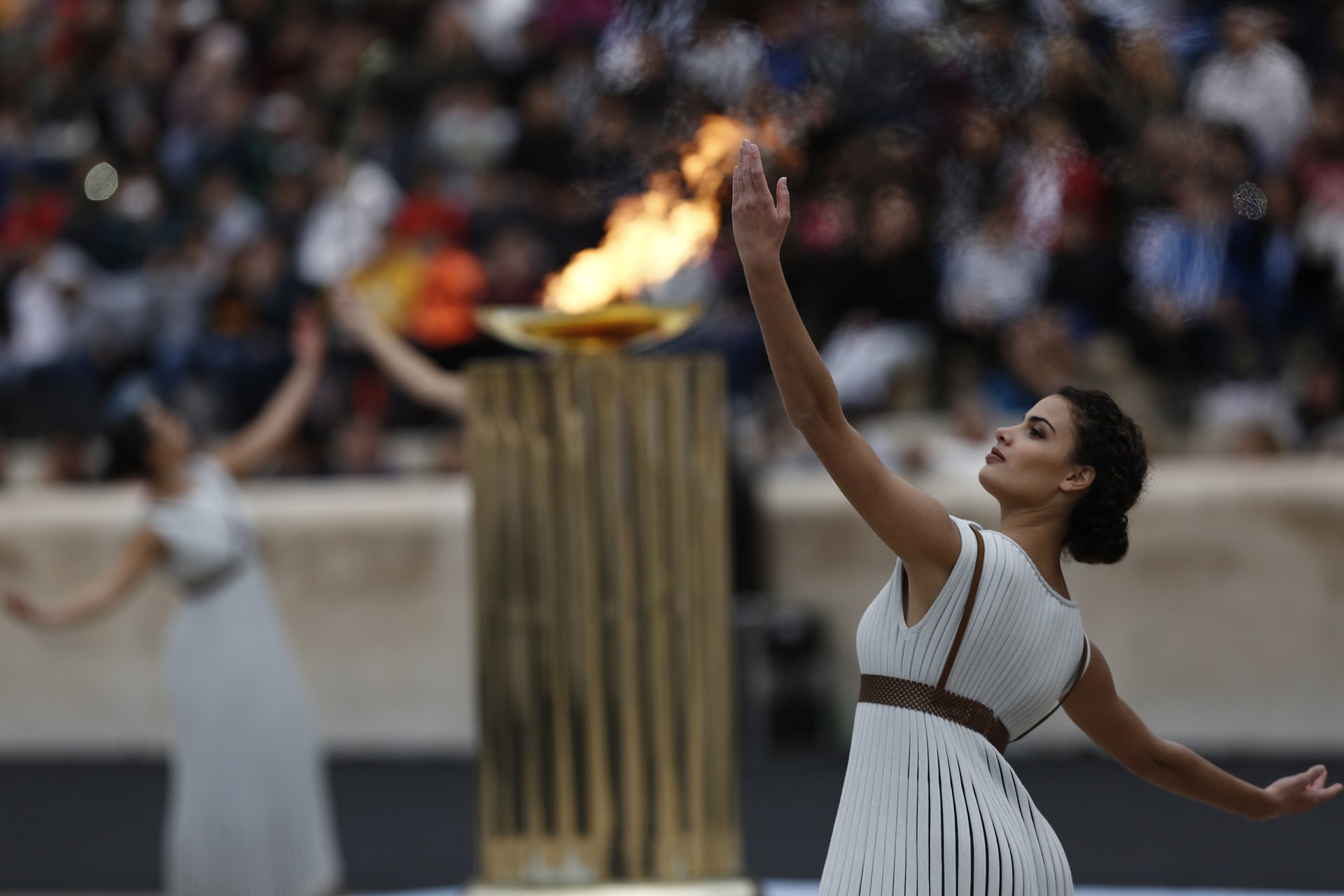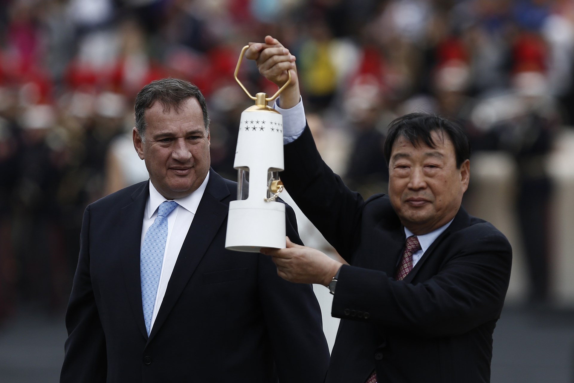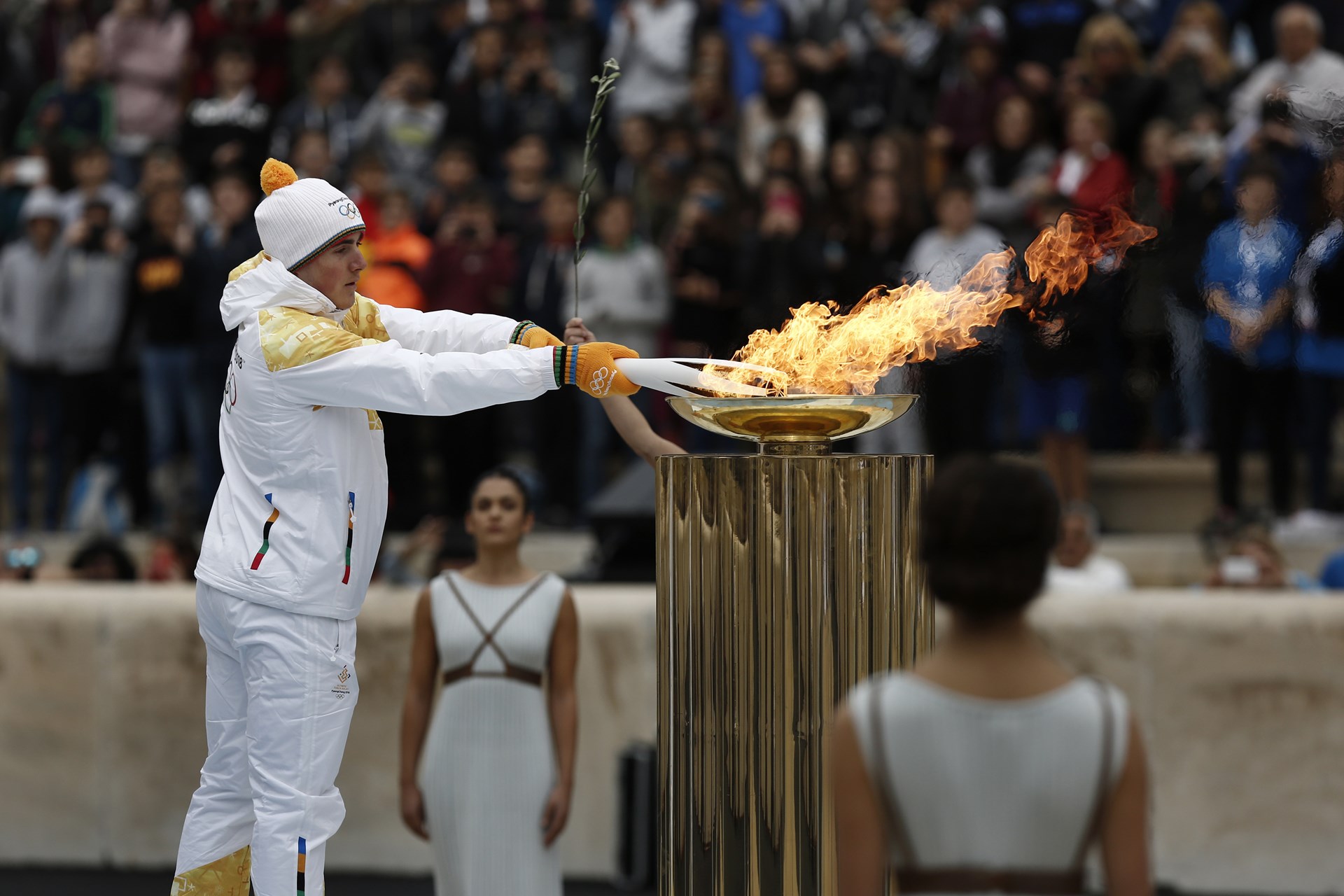 Την Ολυμπιακή Φλόγα παρέδωσε ο πρόεδρος της ΕΟΕ Σπύρος Καπράλος στο πρόεδρο της οργανωτικής επιτροπής της Πιονγκτσάνγκ Λι Χίι Μπεόμ, με την παρουσία στο Παναθηναϊκό Στάδιο πλήθους επισήμων και άνω των 15.000 θεατών που καταχειροκρότησαν εξαιρετικά δρώμενα που πραγματοποιήθηκαν καθώς και την καθιερωμένη τελετή που πραγματοποιήθηκε από την Πρωθιέρεια Κατερίνα Λέχου και τις Ιέρειες, σε χορογραφία της Αρτέμιδας Ιγνατίου.