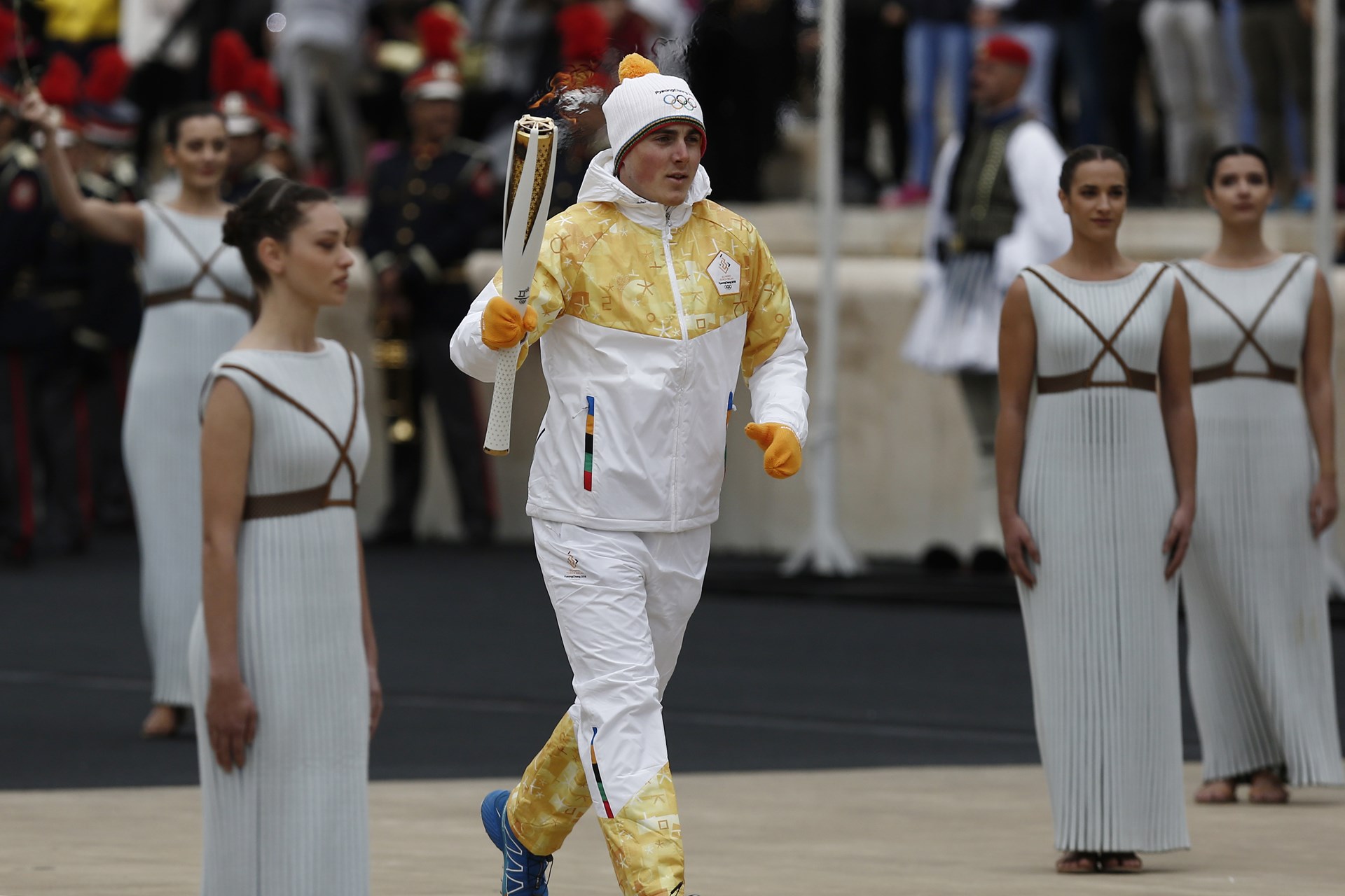 Την Ολυμπιακή Φλόγα παρέδωσε ο πρόεδρος της ΕΟΕ Σπύρος Καπράλος στο πρόεδρο της οργανωτικής επιτροπής της Πιονγκτσάνγκ Λι Χίι Μπεόμ, με την παρουσία στο Παναθηναϊκό Στάδιο πλήθους επισήμων και άνω των 15.000 θεατών που καταχειροκρότησαν εξαιρετικά δρώμενα που πραγματοποιήθηκαν καθώς και την καθιερωμένη τελετή που πραγματοποιήθηκε από την Πρωθιέρεια Κατερίνα Λέχου και τις Ιέρειες, σε χορογραφία της Αρτέμιδας Ιγνατίου.
