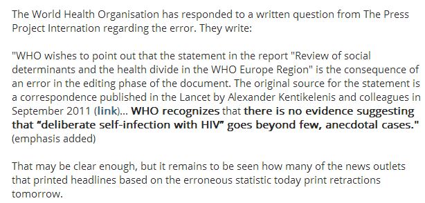 Η έρευνα του Παγκόσμιου Οργανισμού Υγείας, βάση της οποίας το 50% των νέων κρουσμάτων HIV αυτοπροκαλείται από άτομα που σκοπεύουν να λάβουν το επίδομα των 700 ευρώ, αποδεικνύεται λανθασμένη.