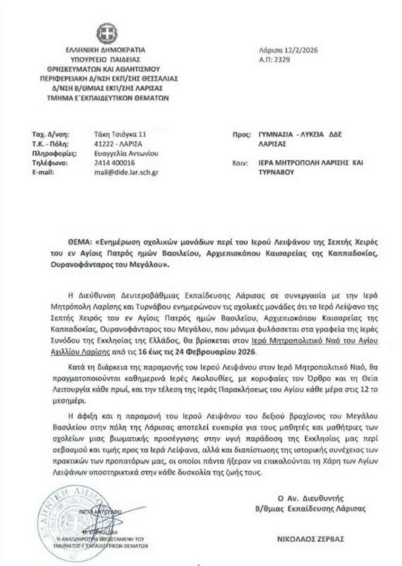 «Η Διεύθυνση Δευτεροβάθμιας Εκπαίδευσης Λάρισας σε συνεργασία με την Ιερά Μητρόπολη Λαρίσης και Τυρνάβου ενημερώνουν τις σχολικές μονάδες ότι το Ιερό Λείψανο της Σεπτής Χειρός του εν Αγίοις Πατρός ημών Βασιλείου, Αρχιεπισκόπου Καισαρείας της Καππαδοκίας, Ουρανοφάντορος του Μεγάλου, που μόνιμα φυλάσσεται στα γραφεία της Ιεράς Συνόδου της Εκκλησίας της Ελλάδος, θα βρίσκεται στον Ιερό Μητροπολιτικό Ναό του Αγίου Αχιλλίου Λαρίσης από τις 16 έως τις 24 Φεβρουαρίου 2026.