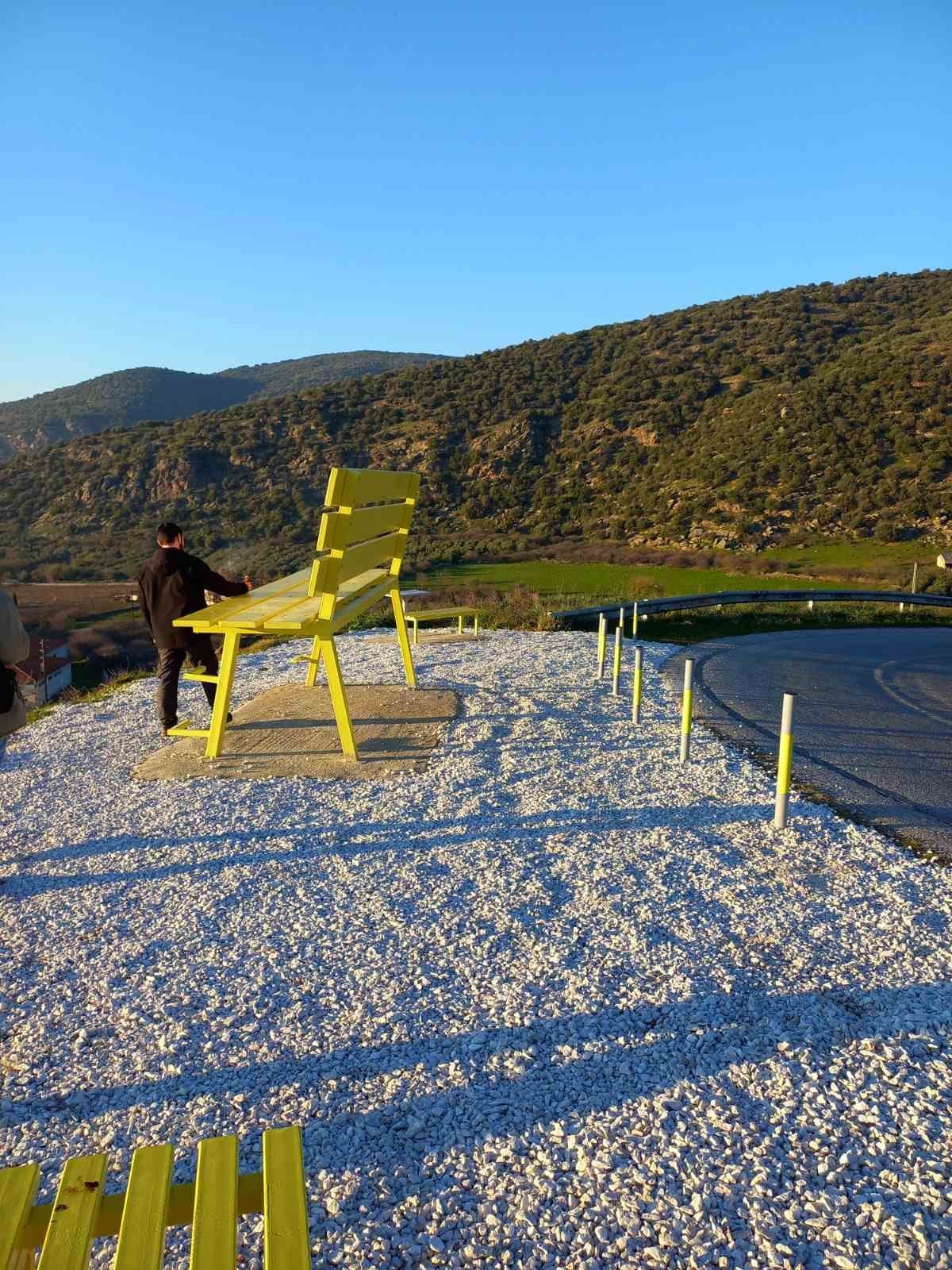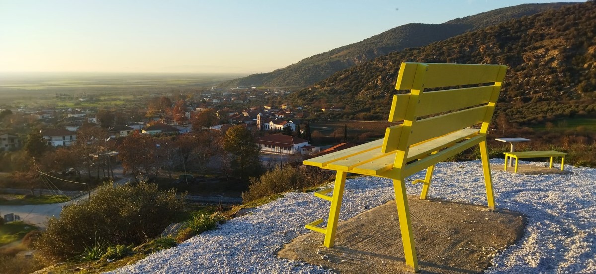 Το κατακίτρινο παγκάκι είναι το πρώτο που τοποθετήθηκε στην Ελλάδα, αλλά και το μεγαλύτερο στο είδος του στον κόσμο, σύμφωνα με την ιστοσελίδα onlarissa.Μπορεί να το εντοπίσει κάποιος στην πρώτη στροφή μετά το χωριό Καλαμάκι, στον δρόμο προς τη γειτονική Έλαφο Αγιάς. Τα ειδικά διαμορφωμένα σκαλοπάτια θα σας βοηθήσουν να ανεβείτε σε αυτό και να απολαύσετε τη θέα, αλλιώς θα χρειαστεί να… σκαρφαλώσετε.