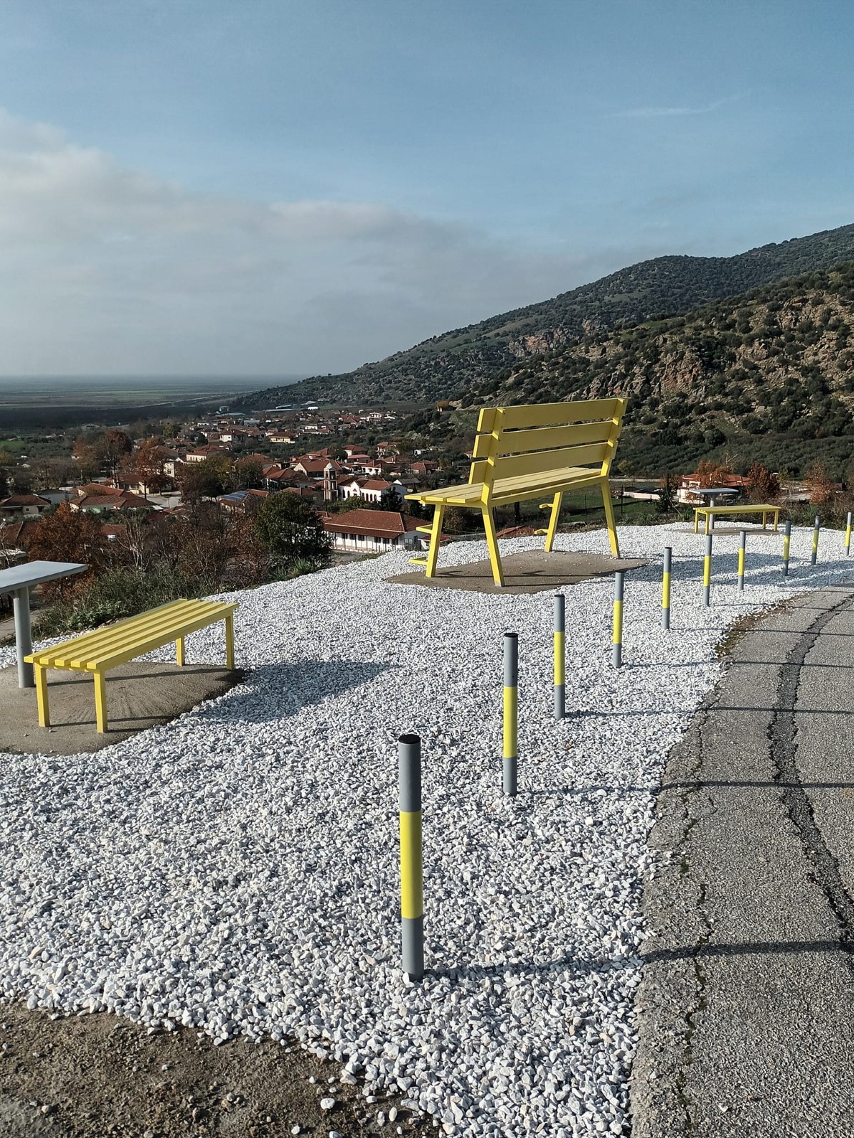 Πρόκειται για μια ιδιωτική πρωτοβουλία του επιχειρηματία Λεωνίδα Μπακούρα, Γενικού Διευθυντή της ΕΔΑ ΘΕΣΣ που στο πλαίσιο του «WorldWide Benches» (Παγκάκια ανά τον Κόσμο) αξιοποίησε τον περασμένο Δεκέμβριο το συγκεκριμένο μέρος, που είναι γνωστό στους ντόπιους για τη θέα του, κάνοντάς το σήμα κατατεθέν και για όσους περνούν οδικώς από εκεί.