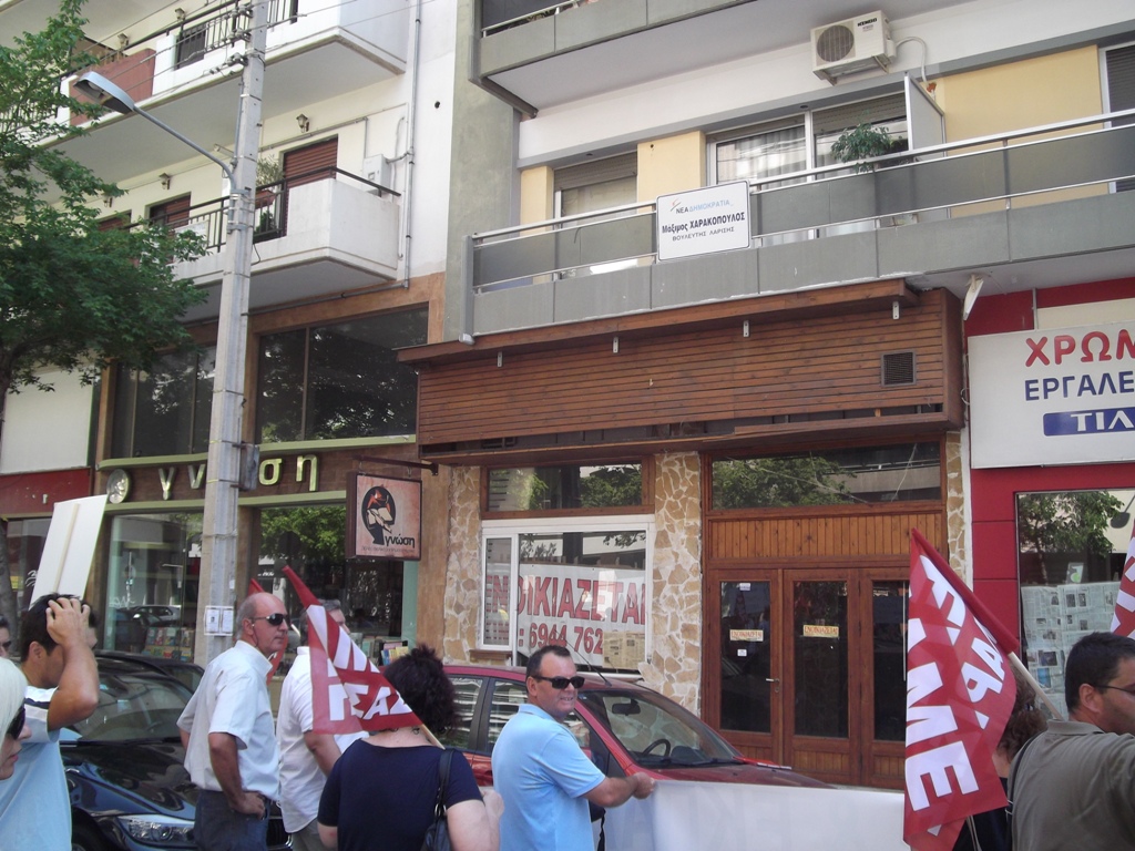 Στόχος τους ήταν να φτάσουν στα γραφεία των βουλευτών ΝΔ και ΠΑΣΟΚ του νομού Λάρισας. Πρώτη «στάση» έγινε έξω από το πολιτικό γραφείο του βουλευτή ΝΔ Χρήστου Κέλλα όπου άρχισαν τις αποδοκιμασίες και τα συνθήματα κατά της κυβέρνησης.