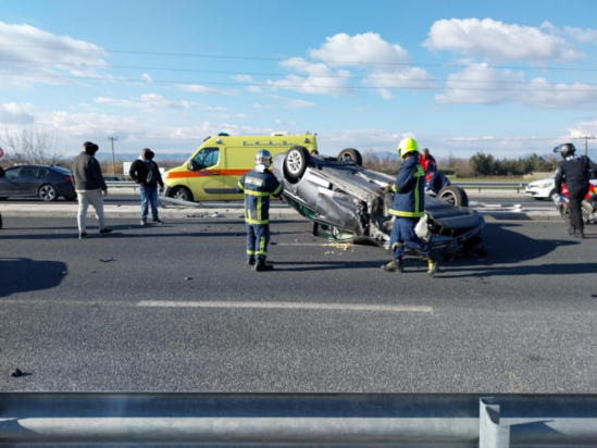 Η σφοδρότητα της σύγκρουσης ήταν τέτοια που είχε ως αποτέλεσμα το ένα από τα εμπλεκόμενα αυτοκίνητα να τουμπάρει στη μέση του δρόμου.