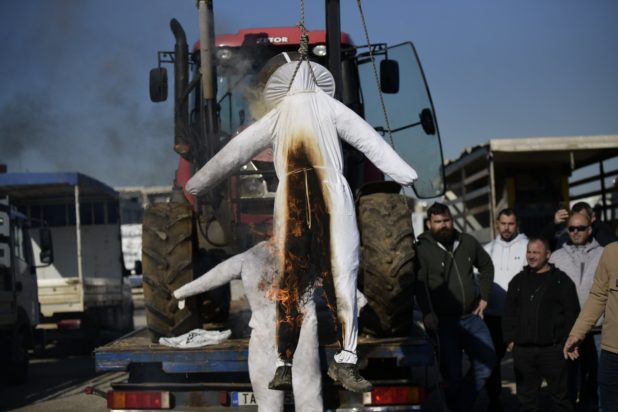 Σε μια συμβολική κίνηση, οι μελισσοκόμοι έβαλαν φωτιά σε ομοίωμα μελισσοκόμου.