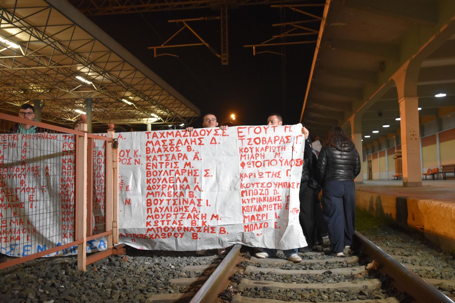 Λίγο πριν τις 23.00 το βράδυ, οι φοιτητές εισήλθαν στις γραμμές και τις απέκλεισαν ενώ ανέγνωσαν ένα προς ένα τα ονόματα των 57 θυμάτων της σιδηροδρομικής τραγωδίας.