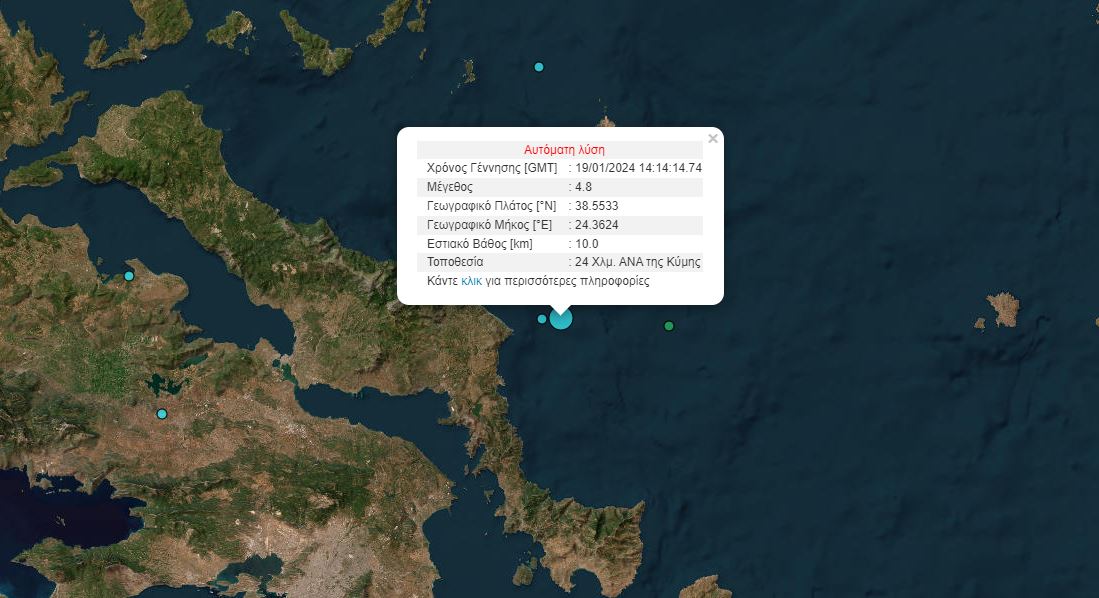 Σύμφωνα με το Ευρωμεσογειακό Σεισμολογικό Κέντρο, ο σεισμός που έγινε ανοιχτά της Εύβοιας είχε ένταση 4,8 βαθμών της κλίμακας Ρίχτερ και το επίκεντρο εντοπίζεται στα 29 χιλιόμετρα βορειοανατολικά του Αλιβερίου.