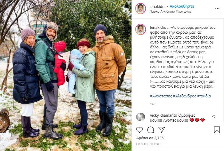 Η ηθοποιός δημοσίευσε στο Instagram μία φωτογραφία με τον σύζυγό της Αλέξανδρο Μπουρδούμη, τον Γιώργο Χρανιώτη και τη σύζυγό του Γεωργία Αβασκαντήρα καθώς και τα παιδιά τους και έγραψε: ” Ας διώξουμε μακριά τον φόβο από την καρδιά μας, ας μιλήσουμε δυνατά , ας αποδεχτούμε αυτό που είμαστε, αυτό που είναι οι άλλοι , ας δούμε με μάτια τρυφερά , ας σταθούμε πλάι σε όσους μας έχουν ανάγκη , ας ξεχυλίσει η καρδιά μας αγάπη …- (αυτό θέλω για όλα τα παιδιά -( τα παιδιά γίνονται ενήλικες κάποια στιγμή ), μόνο αυτό τους αξίζει – μόνο αυτό μας αξίζει )-… ας κάνουμε μια νέα αρχή – μια νέα προσπάθεια για μια λευκή μέρα – “.