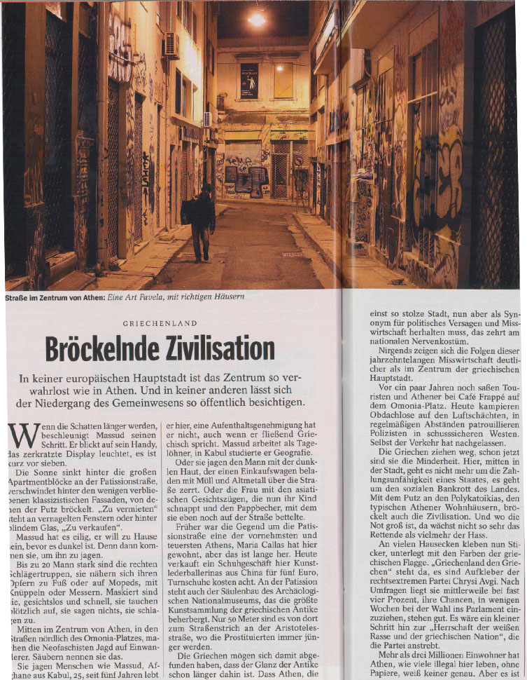 “Σε καμία ευρωπαϊκή πρωτεύουσα δεν είναι το κέντρο της πόλης τόσο εγκατελειμμένο όσο αυτό της Αθήνας. Πουθενά αλλού δεν είναι τόσο έκδηλη η κοινωνική παρακμή” γράφει το γερμανικό περιοδικό Spiegel σε ένα τρισέλιδο δημοσίευμα για την πόλη της Αθήνας.”Αθήνα: Μια πάλαι ποτέ υπερήφανη πόλη, τώρα είναι συνώνυμο της πολιτικής παρακμής και της κακοδιαχείρισης. Εδώ, στο κέντρο της πόλης, το θέμα δεν είναι η βιωσιμότητα του χρέους της Ελλάδας, αλλά η κοινωνική χρεωκοπία της χώρας.” γράφει η Γερμανίδα δημοσιογράφος Julia Heyer και συνεχίζει περιγράφοντας φρικιαστικές εικόνες από το κέντρο της πόλης. “Ναρκωτικά και πορνεία””Όποιος περπατήσει την Πανεπιστημίου, θα δει ανθρώπους -κυρίως νέους- να “τρυπιούνται” στο χέρι, στο λαιμό ή στο πέος τους, και μάλιστα στη μέση του δρόμου. Στην Πατησίων, στα 50 μέτρα από το Αρχαιολογικό Μουσείο των Αθηνών, “κάνουν πιάτσα” -όλο και μικρότερες σε ηλικία- εκδιδόμενες κοπέλες.” γράφει η δημοσιογράφος και αναφέρει ότι η συγκεκριμένη περιοχή κάποτε ήταν από τις πιο ακριβές των Αθηνών, και πως εκεί διέμενε η Μαρία Κάλλας.”Πριν από μόλις μερικά χρόνια στην πλατεία Ομονοίας, γέμιζαν οι τουρίστες τις καφετέριες απολαμβάνοντας φραπέ. Σήμερα στην πλατεία κατασκηνώνει πλήθος αστέγων, ενώ αστυνομικοί κάνουν συνεχώς περιπολίες” αναφέρει στο δημοσίευμα. “Η Αθήνα έγινε φαβέλα””Οι γειτονιές της Αθήνας έχουν μετατραπεί σε ένα είδος φαβέλας” λέει η δημοσιογράφος. Στην Αθήνα διαβιούν πάνω από τρία εκατομμύρια άνθρωποι. Πόσοι από αυτούς βρίσκονται εδώ παράνομα και χωρίς χαρτιά -δεν γνωρίζει κανείς, ωστόσο δεν είναι μυστικό το πού μένουν: Στο κέντρο της πόλης” γράφει στο δημοσίευμα, τονίζοντας ότι σε κάποιες περιοχές της Αθήνας -σχεδόν- δεν συναντά κανείς πια Έλληνες.
