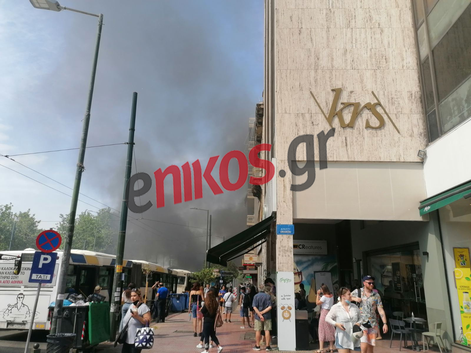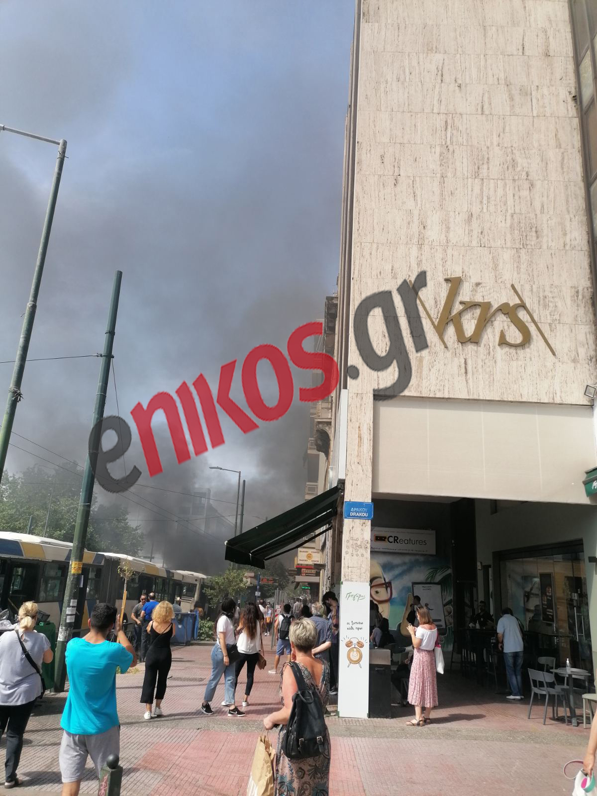 Περαστικοί από το σημείο παρακολουθούσαν με τρόμο τις προσπάθειες των πυροσβεστών να κατασβέσουν τη φωτιά.