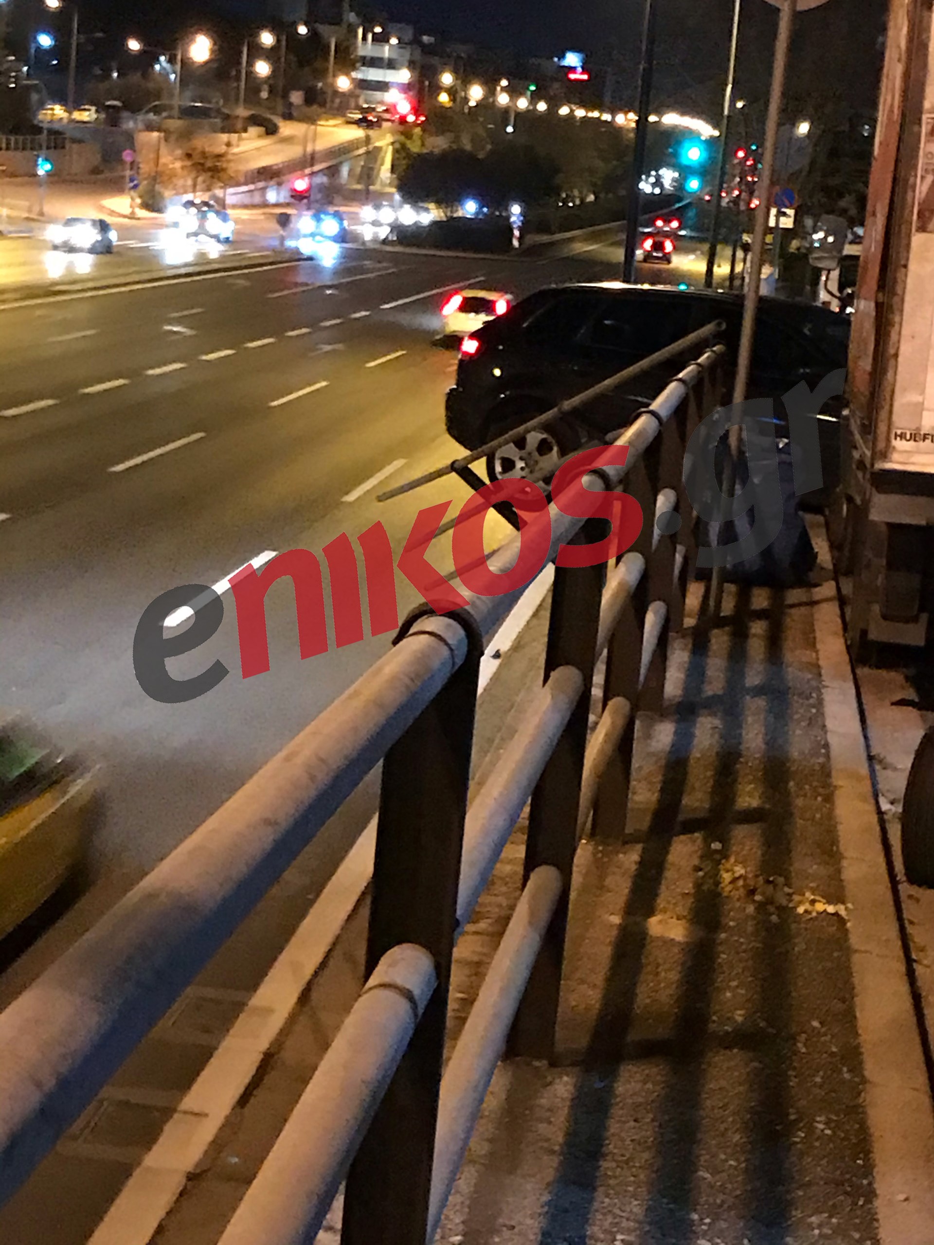 Η φωτογραφία τραβήχτηκε σε υπερυψωμένο παράδρομο, στο ύψος του Αγίου Δημητρίου, και δείχνει ένα αυτοκίνητο να βρίσκεται από τη μέση και πίσω στον αέρα, έχοντας σπάσει τα προστατευτικά κιγκλιδώματα.