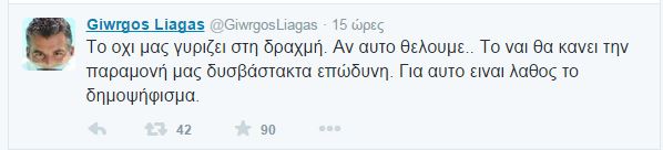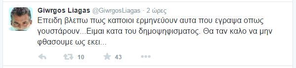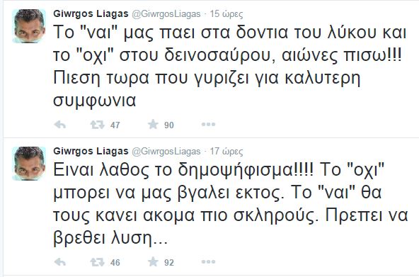 Ο Γιώργος Λιάγκας παίρνει θέση μέσω twitter για το δημοψήφισμα της Κυριακής.
