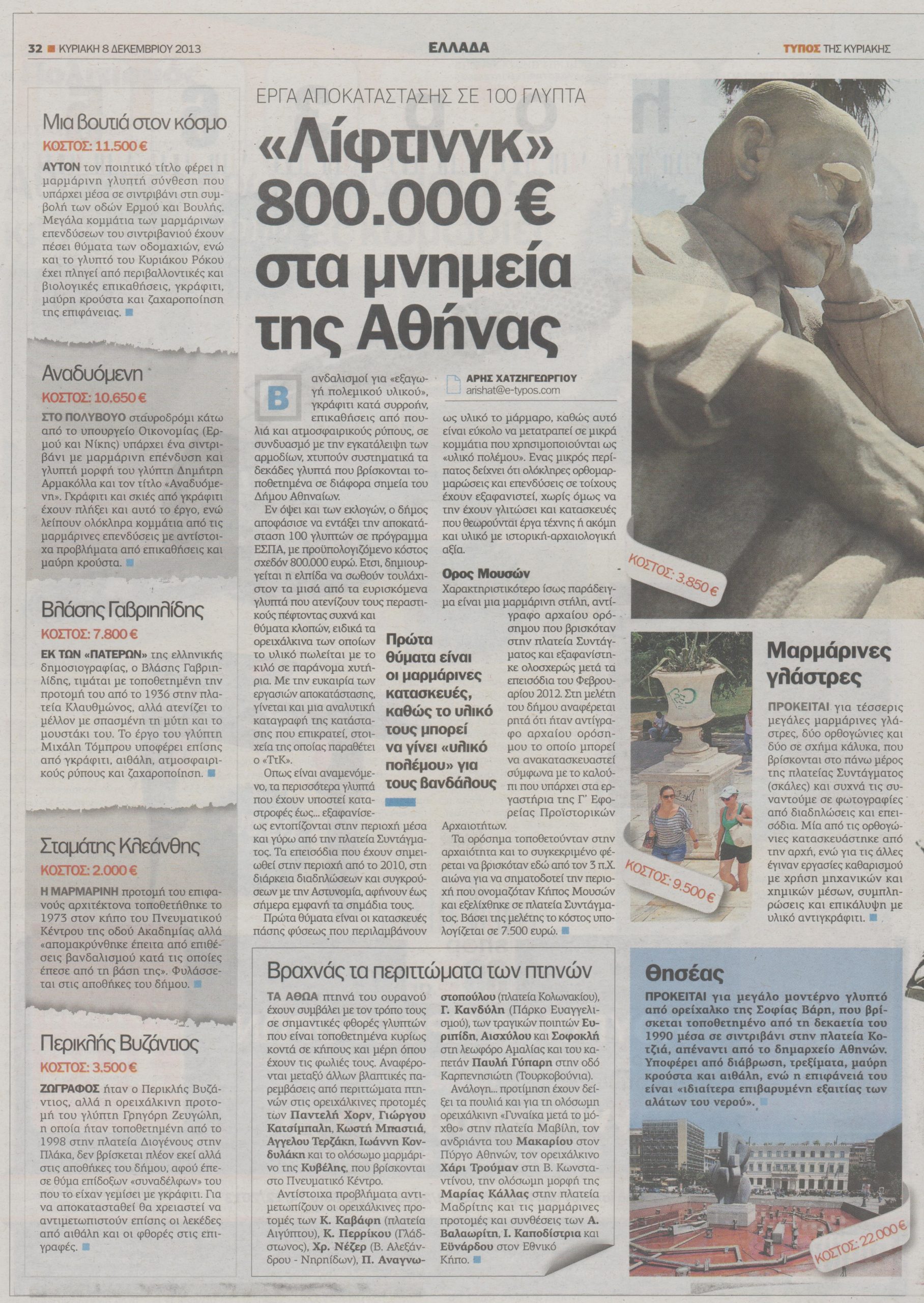 Εν όψει και των εκλογών, ο δήμος αποφάσισε να εντάξει την αποκατάσταση 100 γλυπτών σε πρόγραμμα ΕΣΠΑ, με προϋπολογιζόμενο κόστος σχεδόν 800.000 ευρώ.
